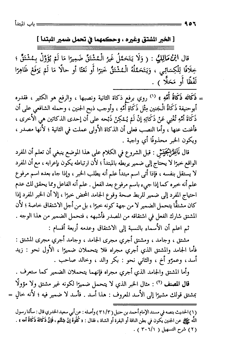 فأما الجامد والمشتق الذي أجري مجراه فلا يتحملان ضميرا، الأول نحو: زيد أسد، وعمرو أخ، والثاني نحو: بكر