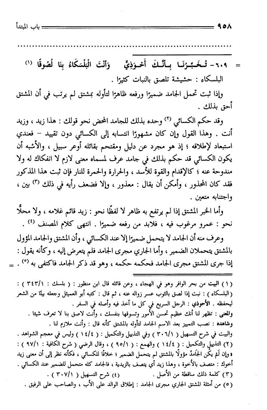 «وإن لم يكن الجامد مؤولا بالمشتق لم يتحمل الضمير؛ خلافا للكسائي، فكأنه نظر إلى أن معنى زيد أخوك: متصف بالأخوة، وهذا زيد أي يتصف بالزيدية، فالجامد كله متحمل للضمير عند الكسائي.