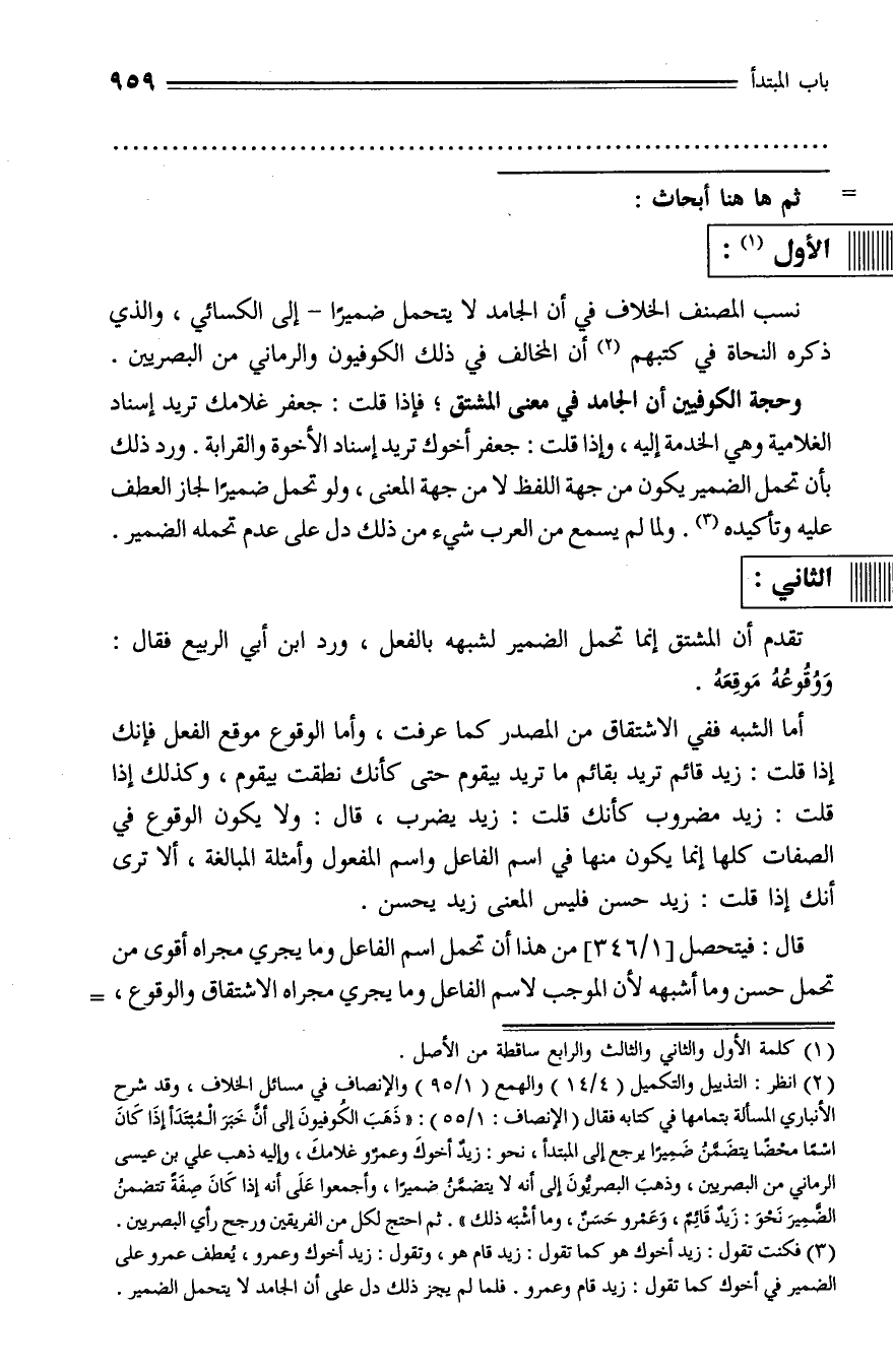 وحجة الكوفيين أن الجامد في معنى المشتق؛ فإذا قلت: جعفر غلامك تريد إسناد الغلامية وهي الخدمة إليه، وإذا قلت: جعفر أخوك تريد إسناد الأخوة والقرابة. ورد ذلك بأن تحمل الضمير يكون من جهة اللفظ لا من جهة المعنى، ولو تحمل ضميرا لجاز العطف عليه وتأكيده (¬3). ولما لم يسمع من العرب شيء من ذلك دل على عدم تحمله الضمير.