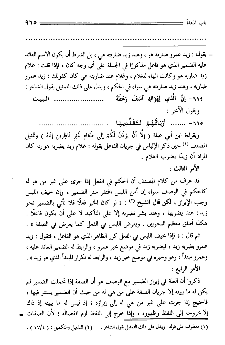 ثم قال: «فإذا خيف اللبس في الفعل كرر الظاهر الذي هو الفاعل، فتقول: زيد عمرو يضربه زيد، فيضربه زيد في موضع خبر عمرو، والرابط له الضمير العائد عليه، وعمرو مبتدأ، وهو وخبره في موضع خبر زيد، والرابط له تكرار المبتدأ الذي هو زيد».