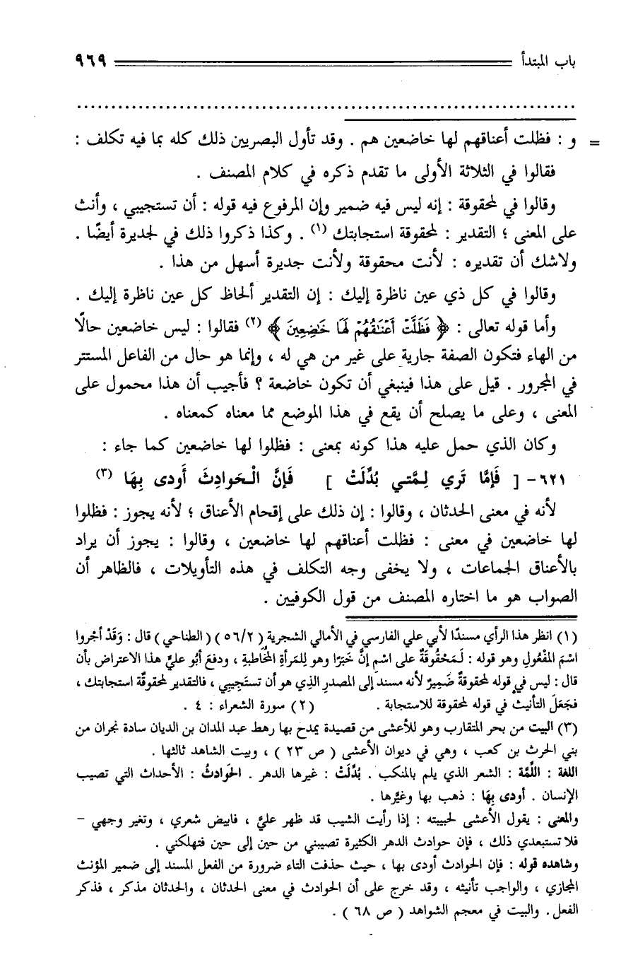لأنه في معنى الحدثان، وقالوا: إن ذلك على إقحام الأعناق؛ لأنه يجوز: فظلوا لها خاضعين في معنى: فظلت أعناقهم لها خاضعين، وقالوا: يجوز أن يراد بالأعناق الجماعات، ولا يخفى وجه التكلف في هذه التأويلات، فالظاهر أن الصواب هو ما اختاره المصنف من قول الكوفيين.