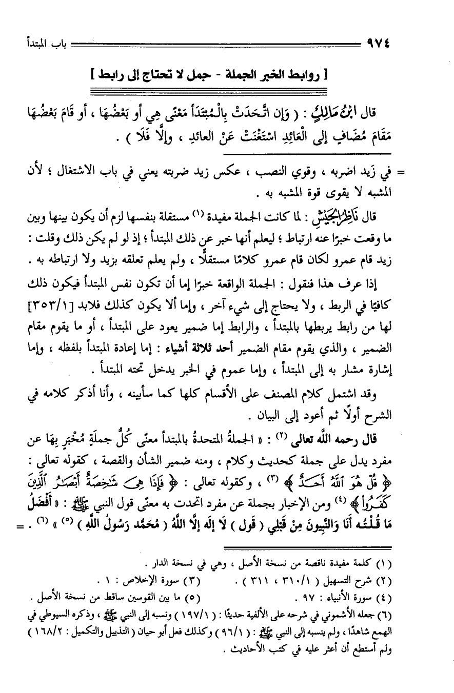 (¬6) جعله الأشموني في شرحه على الألفية حديثا: (1/ 197) ونسبه إلى النبي صلّى الله عليه وسلّم، وذكره السيوطي في الهمع شاهدا، ولم ينسبه إلى النبي صلّى الله عليه وسلّم: (1/ 96) وكذلك فعل أبو حيان (التذييل والتكميل: 2/ 168) ولم أستطع أن أعثر عليه في كتب الأحاديث.