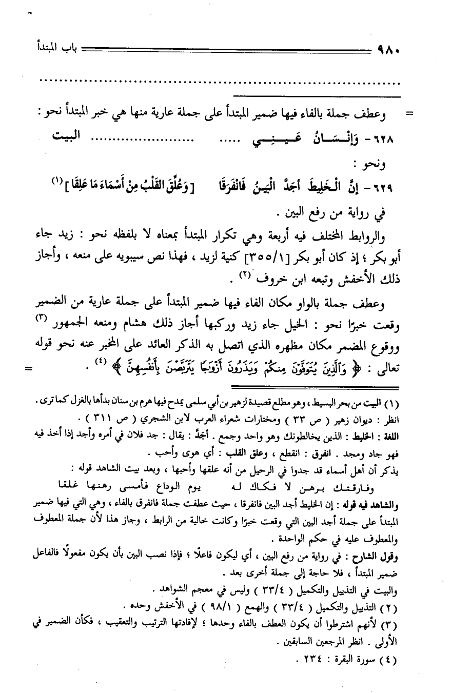 وعطف جملة بالواو مكان الفاء فيها ضمير المبتدأ على جملة عارية من الضمير وقعت خبرا نحو: الخيل جاء زيد وركبها أجاز ذلك هشام ومنعه الجمهور (¬3) ووقوع المضمر مكان مظهره الذي اتصل به الذكر العائد على المخبر عنه نحو قوله تعالى: وَالَّذِينَ يُتَوَفَّوْنَ مِنْكُمْ وَيَذَرُونَ أَزْواجاً يَتَرَبَّصْنَ بِأَنْفُسِهِنَّ (¬4). -
