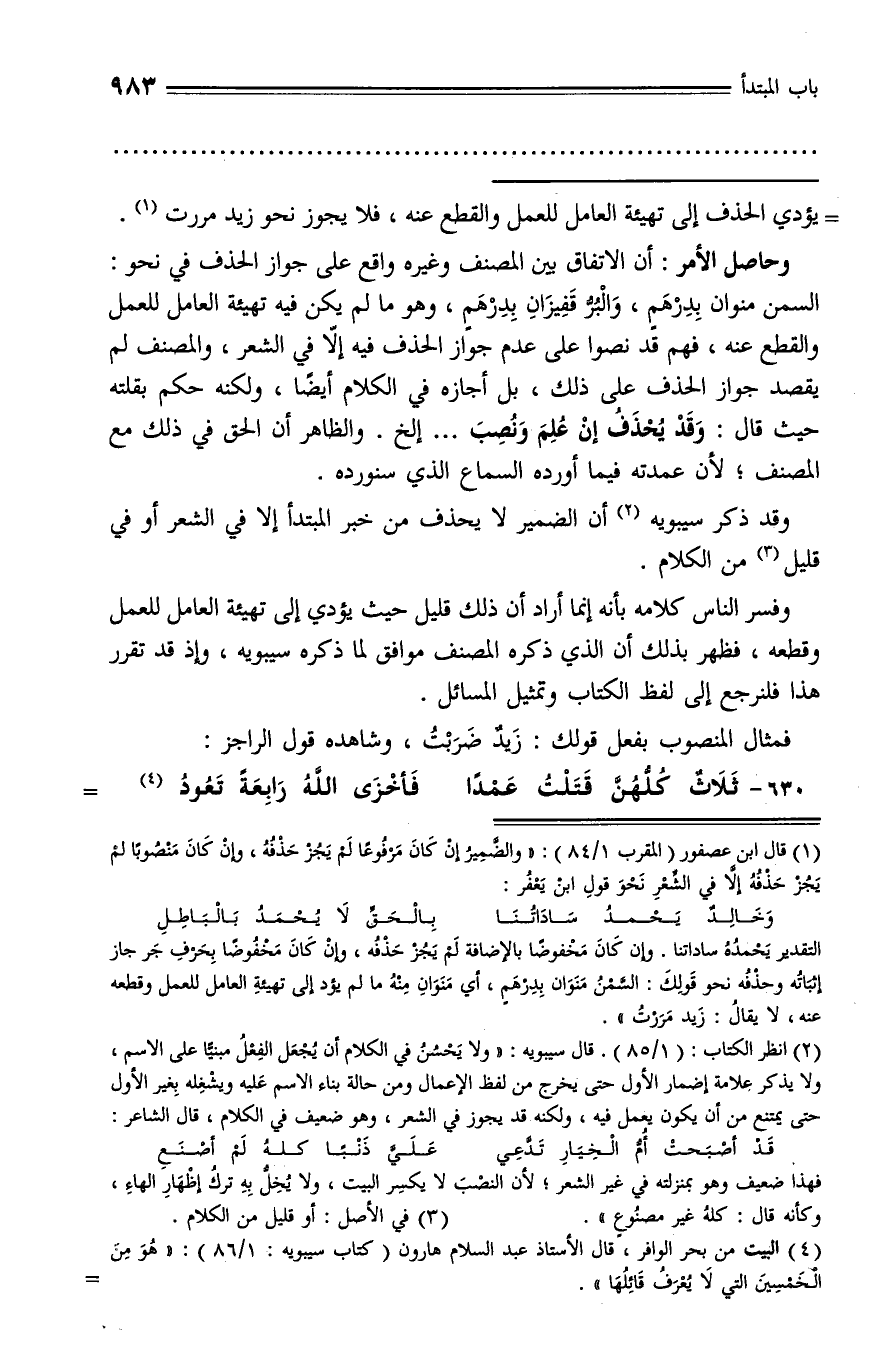 (¬1) قال ابن عصفور (المقرب 1/ 84): «والضّمير إن كان مرفوعا لم يجز حذفه، وإن كان منصوبا لم يجز حذفه إلّا في الشّعر نحو قول ابن يعفر: