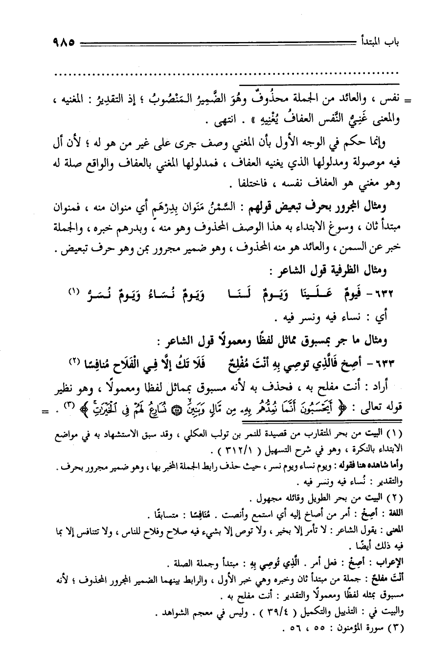 (¬1) البيت من بحر المتقارب من قصيدة للنمر بن تولب العكلي، وقد سبق الاستشهاد به في مواضع الابتداء بالنكرة، وهو في شرح التسهيل (1/ 312).