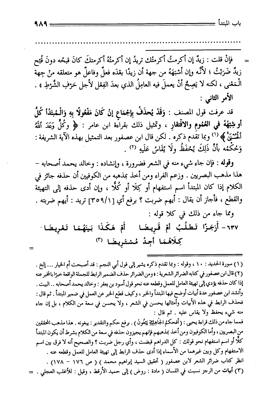 (¬2) قال ابن عصفور في كتابه الضرائر الشعرية: «ومن الضرائر حذف الضمير الرابط للجملة الواقعة خبرا بالمخبر عنه إذا كان حذفه يؤدي إلى تهيئة العامل للعمل وقطعه عنه نحو قول أسود بن يعفر: وخالد يحمد أصحابه .. البيت.