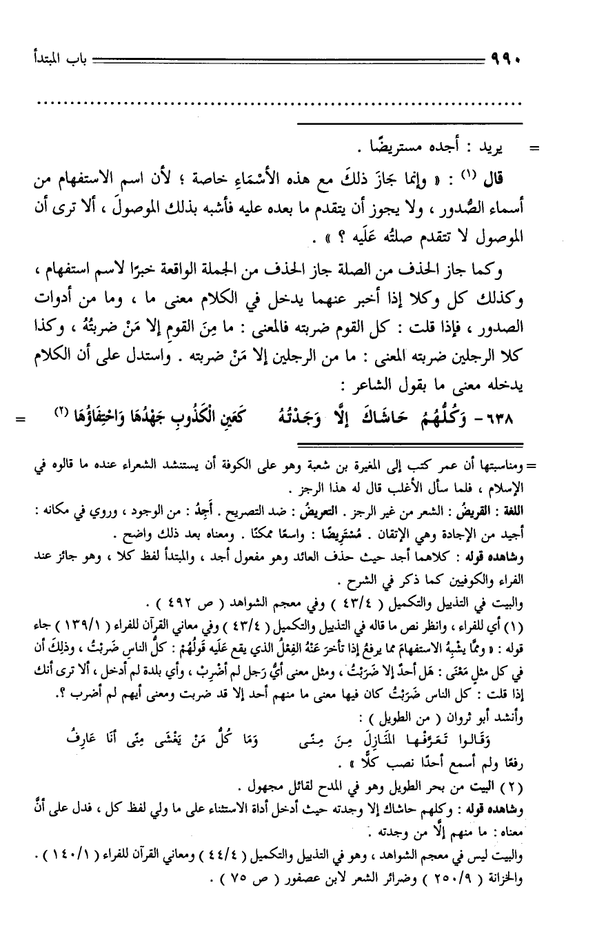 وشاهده قوله: وكلهم حاشاك إلا وجدته حيث أدخل أداة الاستثناء على ما ولي لفظ كل، فدل على أنّ معناه: ما منهم إلّا من وجدته.