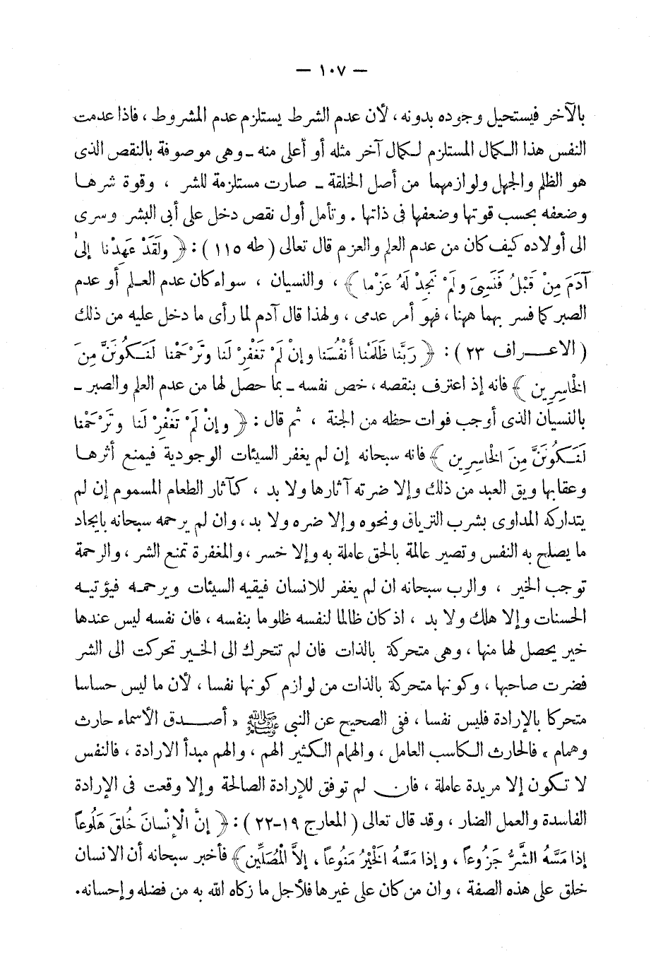 فإِن أَحد الموجودين قد يكون مشروطاً بالآخر فيستحيل وجوده بدونه، لأَن عدم الشرط يستلزم عدم المشروط، فإذا عدمت النفس هذا الكمال المستلزم لكمال آخر مثله أَو أَعلى منه وهى- موصوفة بالنقص الذى هو الظلم والجهل ولوازمها من أَصل الخلقة- صارت متسلزمة للشر، وقوة شرها وضعفه بحسب قوتها وضعفها فى ذاتها. وتأَمل أَول نقص دخل على أَبى البشر وسرى إِلَى أَولاده كيف كان من عدم العلم والعزم. قال تعالى: {وَلَقَدْ عَهِدْنَآ إِلَىَءَادَمَ مِن قَبْلُ فَنَسِيَ وَلَمْ نَجِدْ لَهُ عَزْماً} [طه: 115] والنسيان سواءٌ كان عدم العلم أَو عدم الصبر كما فسر بهما [هاهنا] فهو أَمر عدمى، ولهذا قال آدم لما رأَى ما دخل عليه من ذلك: {رَبّنَا ظَلَمْنَآ أَنفُسَنَا وَإِن لّمْ تَغْفِرْ لَنَا وَتَرْحَمْنَا لَنَكُونَنّ مِنَ الْخَاسِرِينَ} [الأعراف: 23] ، فإِنه إذا اعترف خص نفسه- بما حصل لها من عدم العلم والصبر- بالنسيان الذى أَوجب فوات حظه من الجنة، ثم قال: {وَإِن لّمْ تَغْفِرْ لَنَا وَتَرْحَمْنَا لَنَكُونَنّ مِنَ الْخَاسِرِينَ} [الأعراف: 23] ، فإِنه سبحانه لم يغفر السيئات الوجودية فيمنع أَثرها وعقابها [ونقى] العبد من ذلك وإلا ضرته آثارها ولا بد، [كآثار] الطعام المسموم إِن لم يتداركه المداوى بشرب الترياق ونحوه وإلا ضره ولا بد، وإِن لم يرحمه سبحانه بإِيجاد ما به يصلح النفس وتصير عالمة [بالحق عاملة به] وإِلا خسر.