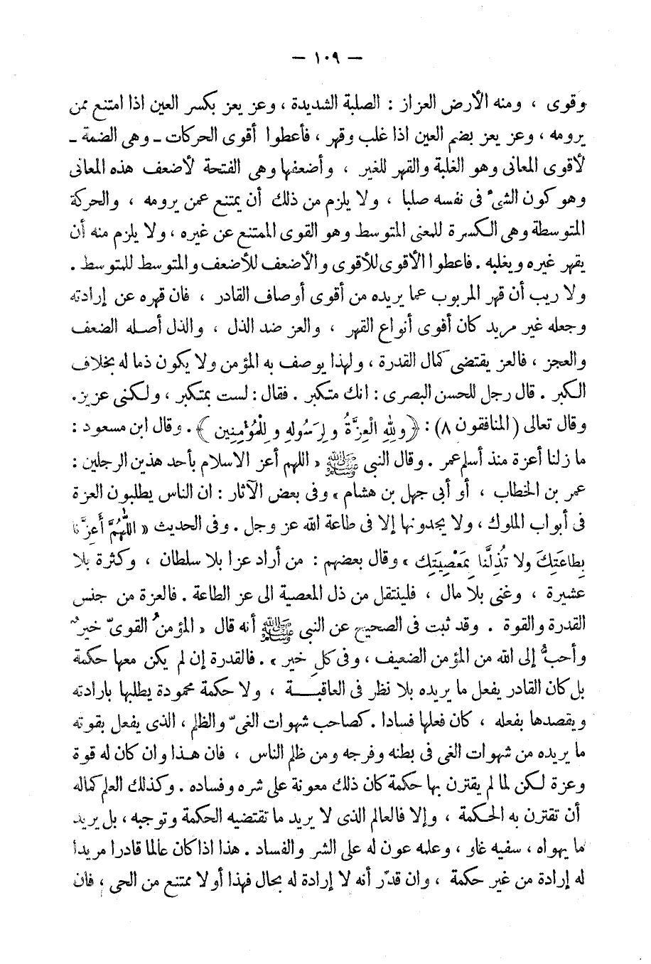 وقوى، ومنه الأرض العزاز: الصلبة الشديدة، وعز يعز بكسر العين إذا امتنع ممن يرومه وعز يعز بضم العين إذا غلب وقهر، فأعطوا أقوى الحركات وهى الضمة- لأقوى المعانى وهو الغلبة والقهر للغير وأضعفها وهى الفتحة لأَضعف هذه المعانى وهو كون الشئ فى نفسه صلباً، ولا يلزم من ذلك أَن يمتنع عمن يرومه والحركة المتوسطة وهى الكسرة للمعنى المتوسط وهو القوى الممتنع عن غيره، ولا يلزم منه أن يقهر غيره ويغلبه، فأعطوا الأقوى للأقوى والأضعف للأضعف والمتوسط للمتوسط. ولا ريب أن قهر [المريد] عما يريده من أقوى أوصاف القادر، فإِن قهره عن إرادته وجعله مريداً كان أَقوى أنواع القهر، والعز ضد الذل، والذل أصله الضعف والعجز فالعز يقتضى كمال القدرة [والعزة] ، ولهذا يوصف به المؤمن ولا يكون ذماً له بخلاف الكبر. قال رجل للحسن البصرى: إنك متكبر. فقال: لست متكبراً، ولكنى [عزز] . وقال تعالى: {وَللهِ العِزَّةُ وَلِرَسُولِهِ وَلِلْمُؤْمِنِينِ} [المنافقون: 8] ، وقال ابن مسعود: ما زلنا أعزة الإسلام [منذ أسلم عمر. وقال النبى صلى الله عليه وسلم "اللهم أعز] بأحد هذيْنِ الرَّجُلَيْنِ: عُمَرَ بْنَ الْخَطَّاب، أَو أَبِى جَهْل بْن هِشَام"، وفى بعض الآثار: إِن الناس بطلبون العزة فى أبواب الملوك، ولا يجدونها إِلا فى طاعة الله عز وجل. وفى الحديث: "اللَّهُمَّ أَعِزَّنَا بِطَاعَتِكَ وَلا تُذِلَّنَا بِمعْصِيتكَ" وقال بعضهم: من أَراد عزاً بلا سلطان، وكثرة بلا عشيرة، وغنى بلا مال، فلينتقل من ذل المعصية إلى عز الطاعة. فالعزة من جنس القدرة والقوة وقد ثبت فى الصحيح عن النبى صلى الله عليه وسلم أَنه قال: "الْمُؤْمِنُ الْقَوِى خَيْر وَأَحَبُّ إِلَى اللهُ مَنَ الْمُؤْمِنِ الضعيف، وفى كل خير". فالقدرة إن لم يكن معها حكمة بل كان القادر يفعل ما يريده بلا نظر فى العاقبة، ولا حكمة محمودة يطلبها بإرادته ويقصدها بفعله، كان [فعلة] فساداً كصاحب شهوات الغى والظلم، الذى [يفعله] بقوته ما يريده من شهوات الغى فى بطنه وفرجه ومن ظلم الناس، فإِن هذا وإن كان له قوة وعزة لكن لما لم يقترن بها حكمة كان ذلك معونة على شره وفساده. وكذلك العلم كماله أن [نقترن به الحكمة وإلا فالعالم الذى لا يريد ما] تقتضيه الحكمة وتوجبه، بل يريد ما يهواه، سيفه غاوٍ، [وعلمه عون له على الشر والفساد هذا إذا كان عالماً قادراً] مريداً له إِرادة من غير حكمة، وإِن قدر أنه لا إرادة له فهذا أولاً ممتنع من الحى، فإن