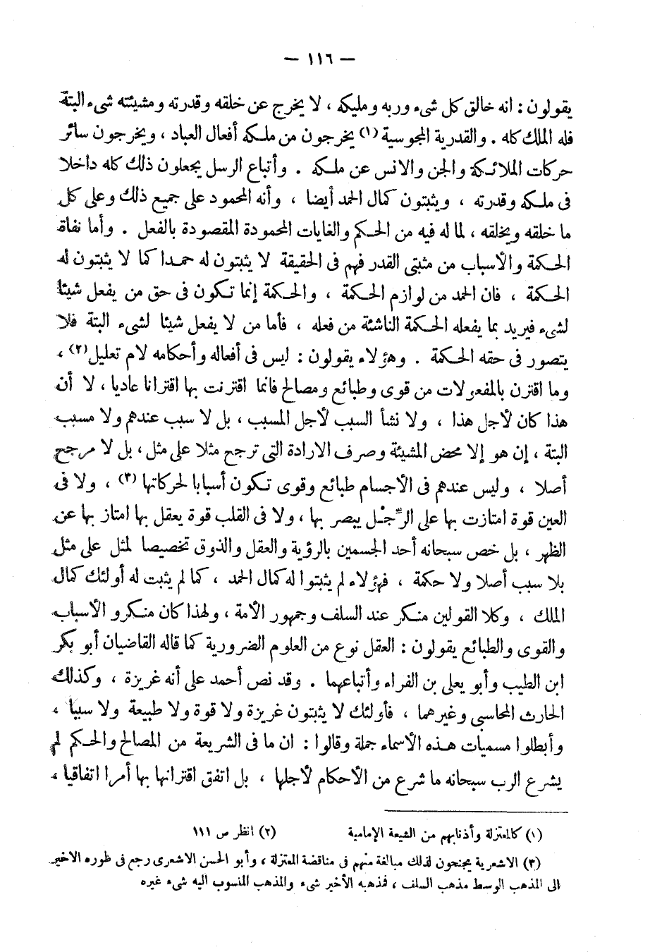 يقولون: إِنه خالق كل شيء وربه ومليكه، لا يخرج عن خلقه وقدرته ومشيئته شيء البتة فله الملك كله. والقدرية المجوسية يخرجون من ملكه أَفعال العباد، فيخرجون [طاعات الأنبياء والمرسلين والملائكة والمتقين من ملكه كما يخرجون] سائر حركات الملائكة والجن والإِنس عن ملكه. وأَتباع الرسل يجعلون ذلك كله داخلاً [تحت] ملكه وقدرته، ويثبتون كمال الحمد أَيضاً، وأَنه المحمود على جميع ذلك وعلى كل ما خلقه ويخلقه، لما له فيه من الحكم والغايات المحمودة المقصودة بالفعل. وأَما نفاة الحكمة والأَسباب من مثبتى القدر فهم فى الحقيقة لا يثبتون له حمداً كما لا يثبتون له الحكمة فإن الحمد من لوازم الحكمة والحكمة إِنما تكون فى حق من يفعل شيئاً لشيء فيريد بما يفعله الحكمة الناشئة من فعله فأما من لا يفعل شيئاً لشيء البتة فلا يتصور فى حقه الحكمة. وهؤلاءِ يقولون: ليس فى أَفعاله وأَحكامه لام التعليل، وما اقترن بالمفعولات من قوى وطبائع ومصالح فإِنما اقترنت بها اقتراناً عادياً، لا أَن هذا كان لأَجل هذا، ولا نشأَ السبب لأَجل المسبب، بل لا سبب عندهم ولا مسبب البتة، إِن هو إِلا محض المشيئة وصرف الإِرادة التى ترجح مثلاً على مثل، بل لا مرجح أَصلاً، وليس عندهم فى الأَجسام وطبائع وقوى تكون أَسباباً لحركاتها، ولا فى العين قوة امتازت بها على الرِّجل يبصر بها، ولا فى القلب قوة يعقل بها امتاز بها [على] الظهر، بل خص سبحانه أَحد الجسمين بالرؤية والعقل والذوق تخصيصاً لمثل على مثل بلا سبب أَصلاً ولا حكمة، فهؤلاءِ لم يثبتوا له كمال الحمد، كما لم يثبت له أُولئك كمال الملك، وكلا القولين منكر عند السلف وجمهور الأُمة.