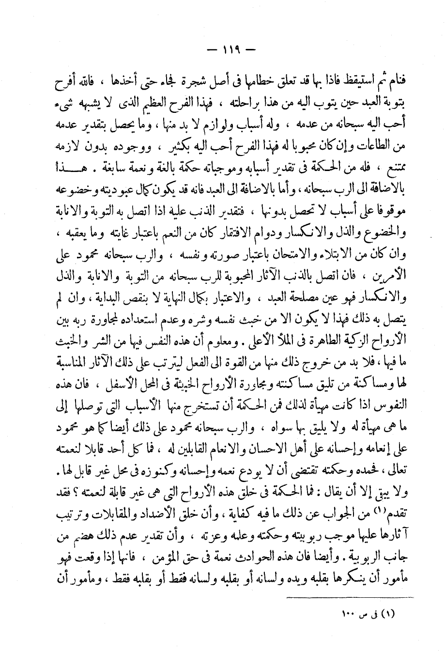 ولا يبقى إِلا أَن يقال: فما الحكمة فى خلق هذه الأرواح التى هى غير قابلة لنعمته؟ فقد تقدم من الجواب عن ذلك ما فيه كفاية. وأَن خلق الأضداد والمقابلات وترتيب آثارها عليها موجب ربوبيته وحكمته وعلمه وعزته، وأَن تقدير عدم ذلك هضم من جانب الربوبية. وأَيضاً فإن هذه الحوادث نعمة فى حق المؤمن، فإِنها إِذا وقعت فهو مأمور أن نكرها بقلبه ويده ولسانه فقط أَو بقلبه فقط،