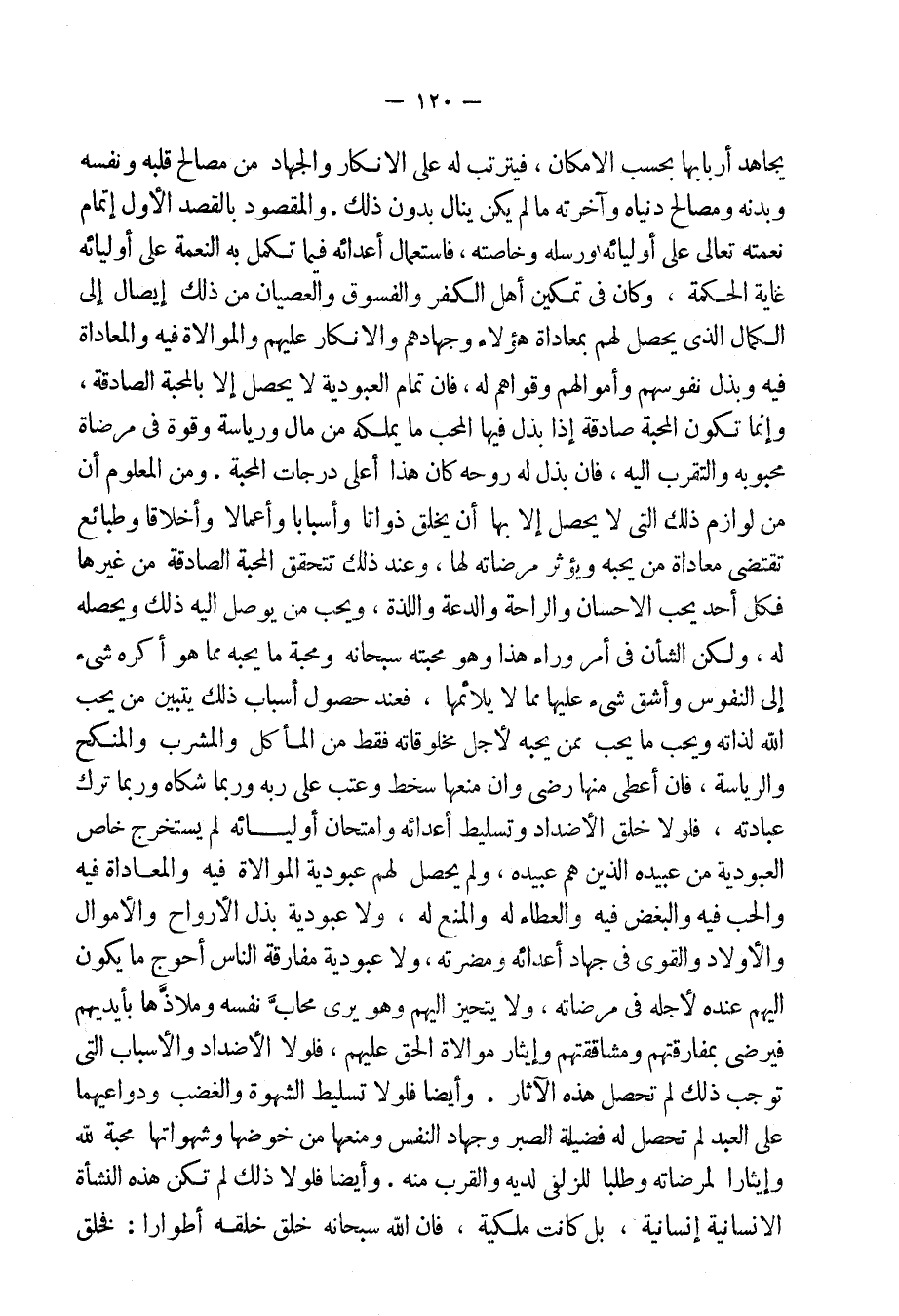 ومأمور أَن يجاهد أَربابها بحسب الإِمكان، فيترتب له على الإنكار والجهاد من مصالح قلبه ونفسه وبدنه ومصالح دنياه، وآخرته ما لم يكن ينال بدون ذلك، والمقصود بالقصد الأول إِتمام نعمته تعالى على أَوليائه ورسله وخاصته فاستعمال أعدائه فيما تكمل به النعمة على أُوليائه غاية الحكمة، وكان فى تمكين أَهل الكفر والفسق والعصيان من ذلك إِيصال إِلى الكمال الذى يحصل لهم بمعاداة هؤلاء وجهادهم والإِنكار عليهم والموالاة فيه والمعاداة فيه وبذل نفوسهم وأَموالهم وقواهم له، فإِن تمام العبودية لا يحصل إِلا بالمحبة الصادقة، وإِنما تكون المحبة صادقة إِذا بذل فيها المحب ما يملكه من مال ورياسة وقوة فى مرضاة محبوبة والتقرب إِليه، فإِن بذل له روحه كان هذا أعلى درجات المحبة، ومن المعلوم أَن من لوازم ذلك التى لا يحصل إِلا بها أَو يخلق ذواتاً وأَسباباً وأَعمالاً وأَخلاقاً وطبائع تقتضى [معاداة من يحبه ويؤثر مرضاته لها وعند ذلك تتحق] المحبة الصادقة من غيرها فكل أَحد يحب الإِحسان والراحة والدعة واللذة، ويجب من يوصل إِليه ذلك ويحصله له، ولكن الشأْن فى أَمر وراءَ هذا وهو محبته سبحانه ومحبة ما يحبه مما هو أَكره شيء إِلى النفوس وأَشق شيء عليها مما لا يلائمها، فعند حصول أَسباب ذلك يتبين من يحب الله لذاته ويحب ما يجب ممن يحبه لأَجل مخلوقاته فقط من المأْكل والمشرب والمنكح والرياسة، فإِن أُعطى منها رضى وإِن منعها سخط وعتب على ربه وربما شكاه وربما ترك عبادته، فلولا خلق الأضداد وتسليط أَعدائه وامتحان أَوليائه بهم لم يستخرج خالص العبودية من عبيده الذين هم عبيده، ولم يحصل لهم عبودية الموالاة فيه والمعاداة [فيه والحب فيه والبغض فيه والعطاء له والمنع له، ولا عبودية بذل الأرواح] فى جهاد أَعدائه ونصرته وعبودية مفارقة الأمر عنده أحوج ما يكون إليهم عبده فى مرضاته ما يتحسر إليهم وهو الذى عاب نفسه وملاذ بها بأيديهم قد جنى بمفارقتهم ومشايعتهم وأما من موالاة الحق عليهم، فلولا الأَضداد والأَسباب التى توجب ذلك لم تحصل هذه الآثار.
