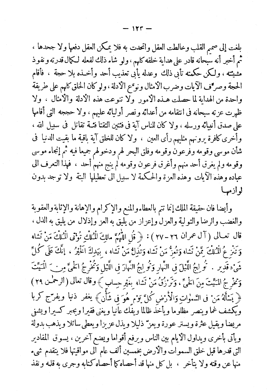 بلغت إِلى صميم القلب وخالطت العقل واتحدت به فلا يمكن العقل دفعها ولا جحدها، ثم أَخبر أَنه سبحانه قادر على هداية خلقه كلهم، ولو شاءَ ذلك لفعله لكمال قدرته ونفوذ مشيئته، ولكن حكمته تأْبى ذلك وعدله يأْبى تعذيب أَحد وأَخذه بلا حجة، فأَقام الحجة وصرّفَ الآيات وضرب الأمثال وَنوَّع الأدلة، ولو كان الخلق كلهم على طريقة واحدة من الهداية لما حصلت هذه الأُمور ولا تنوعت هذه الأَدلة والأَمثال، ولا ظهرت عزته سبحانه فى انتقامه من أَعدائه ونصر أَوليائه عليهم، ولا حججه التى أَقامها على صدق أَنبيائه ورسله ولا كان للناس آية فى فئتين التقتا فئة تقاتل فى سبيل الله، وأُخرى كافرة يرونهم مثليهم رأْى العين، ولا كان للخلق آية باقية ما بقيت الدنيا فى شأْن موسى وقومه وفرعون وقومه وفلق البحر لهم ودخولهم جميعاً فيه ثم إِنجاءَ موسى وقومه ولم يغرق أَحد منهم وأَغرق فرعون وقومه لم ينج منهم أَحد، فهذا التعرف إِلى عباده وهذه الآيات وهذه العزة والحكمة لا سبيل إِلى تعطيلها البتة ولا توجد بدون لوازمها.