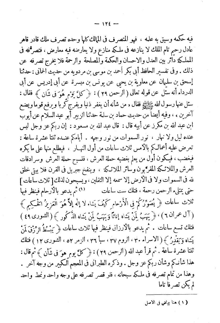 فيه حكمه وسبق به علمه، فهو المتصرف فى الممالك كلها وحده تصرف ملك قادر قاهر عادل رحيم تام الملك لا ينازعه فى ملكه منازع ولا يعارضه فيه معارض، فتصرفه فى المملكة دائر بين العدل والإِحسان والحكمة والمصلحة والرحمة فلا يخرج تصرفه عن ذلك. وفى تفسير الحافظ أَبى بكر أَحمد بن موسى بن مردويه من حديث الحمانى: حدثنا إِسحق بن سليمان عن معاوية بن يحيى عن يونس ابن ميسرة عن أَبى إدريس عن أَبى الدرداء أَنه سئل عن قوله تعالى: {كُلَّ يَوْمِ هُوَ فِى شَأْن} [الرحمن: 29] ، فقال: سئل عنها رسول الله صلى الله عليه وسلم فقال: "مِنْ شَأْنِهِ أَنْ يَغْفِرَ ذَنْباً وَيُفَرِّجَ كَرْباً وَيَرْفَعَ قَوْماً وَيَضَعَ آخَرِينَ، وفيه أيضاً من حديث حماد بن سلمة حدثنا الزبير أَبو عبد السلام عن أَيوب بن عبد الله بن مكرز عن أَبيه قال: قال عبد الله بن مسعود: إن ربكم عز وجل ليس عنده ليل ولا نهار، نور السموات والأرض من نور وجهه. أَيامكم عنده ثنتا عشرة ساعة: تعرض عليه أَعمالكم بالأَمس ثلاث ساعات من أَول النهار، فيطلع منها على ما يكره فيغضب فيكون أَول من يعلم بغضبه حملة العرش، فتسبح حملة العرش وسراداقات العرش والملائكة المقربون وسائر الملائكة، وينفخ جبريل فى القرن فلا يبقى خلق لله فى السموات ولا فى الأرض إلا سمعه إلا الثقلين، ويسبحون [ثلاث ساعات] حتى يمتليء الرحمن رحمة، فتلك ست ساعات ثم يدعو بالأَرحام فينظر فيها ثلاث ساعات: {يُصَوّرُكُمْ فِي الأرْحَامِ كَيْفَ يَشَآءُ لاَ إِلَهَ إِلاّ هُوَ الْعَزِيزُ الْحَكِيمُ} [آل عمران: 6] ، {يَهَبُ لِمَنْ يشَاءُ إِناثاً وَيَهَبُ لِمَنْ يَشَاءُ الذُّكُورَ} [الشورى: 49] ، فتلك تسع ساعات. ثم يدعو بالأرزاق فينظر فيها ثلاث ساعات: {يَبْسُطُ الرِّزْقَ لِمَن يَشَاءُ وَيَقْدِرُ} [الإسراء: 30] [الروم: 37] [سبأ: 36] [الزمر: 52] [الشورى: 12] فتلك اثنتا عشرة ساعة. ثم قرأَ عبد الله: {كُلَّ يومٍ هُوَ فِى شَأْن} [الرحمن: 29] ثم قال: هذا شأْنكم وشأْن ربكم عز وجل. وذكره الطبرانى فى المعجم الكبير من وجه آخر. وهذا من تمام تصرفه فى ملكه سبحانه، فلو قصر تصرفه على وجه واحد ونمط واحد لم يكن تصرفاً تاماً.