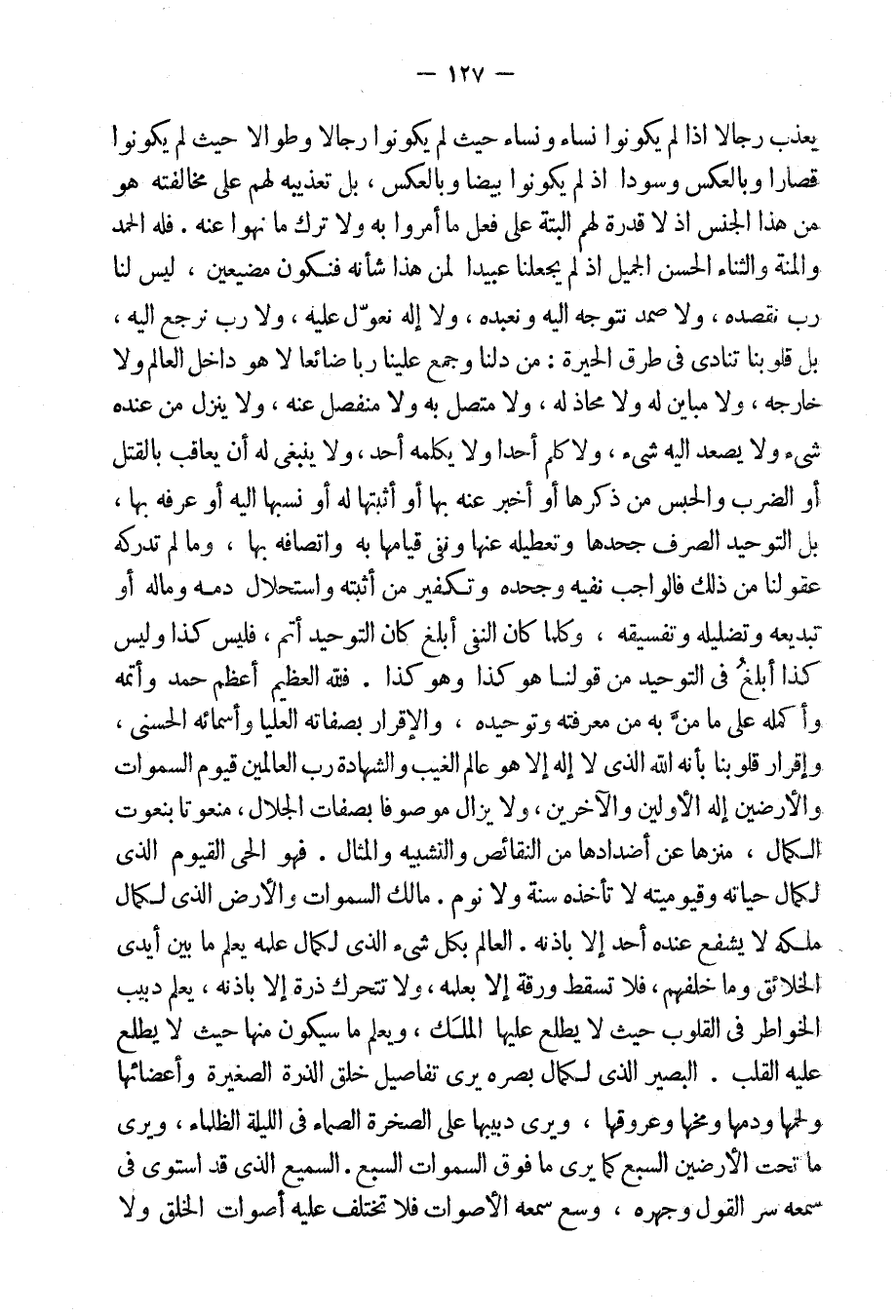 يعذب رجالاً إِذا لم يكونوا نساءَ ونساءً حيث لم يكونوا رجالاً وطوالاً حيث لم يكونوا قصاراً وبالعكس وسوداً إِذا لم يكونوا بيضاً وبالعكس، بل تعذيبه لهم على مخالفته هو من هذا الجنس إذ لا قدرة لهم البتة على فعل ما أُمروا به ولا ترك ما نهوا عنه. فله الحمد والمنة والثناءُ الحسن الجميل إِذ لم يجعلنا عبيداً لمن هذا شأْنه فنكون مضيعين، ليس لنا رب نقصده، ولا صمد نتوجه إِليه ونعبده، ولا إِله نعوّل عليه، ولا رب نرجع إليه بل قلوبنا تنادى فى طرق الحيرة: من دلنا وجمع علينا رباً ضائعاً لا هو داخل العالم ولا خارجه، ولا مباين له ولا محاذ له، ولا متصل به ولا منفصل عنه، ولا نزل من عنده شيء ولا يصعد إليه شيء، ولا كلَّم أَحداً ولا يكلمه أَحد، ولا ينبغى [لأحد أن يذكر صفاته ولايعرفه بها بل يذكرها بلسانه فلا يتكلم بها وبقلبه فلا يعقلها وينبغى] له أَن يعاقب بالقتل أَو بالضرب والحبس من ذكرها أَو أَخبر عنه بها أَو أَثبتها له. أَو نسبها إلِيه أَوْ عرفه بها، بل التوحيد الصرف جحدها وتعطيله عنها ونفى قيامها به واتصافه وما لم تدركه عقولنا من ذلك فالواجب نفيه وجحده [وتكفير] من أثبته واستحلال دمه وماله أو تبديعه وتضليله وتفسيقه، وكلما كان النفى أَبلغ كان التوحيد أتم، فليس كذا وليس كذا أَبلغُ فى التوحيد من قولنا هو كذا وهو كذا.