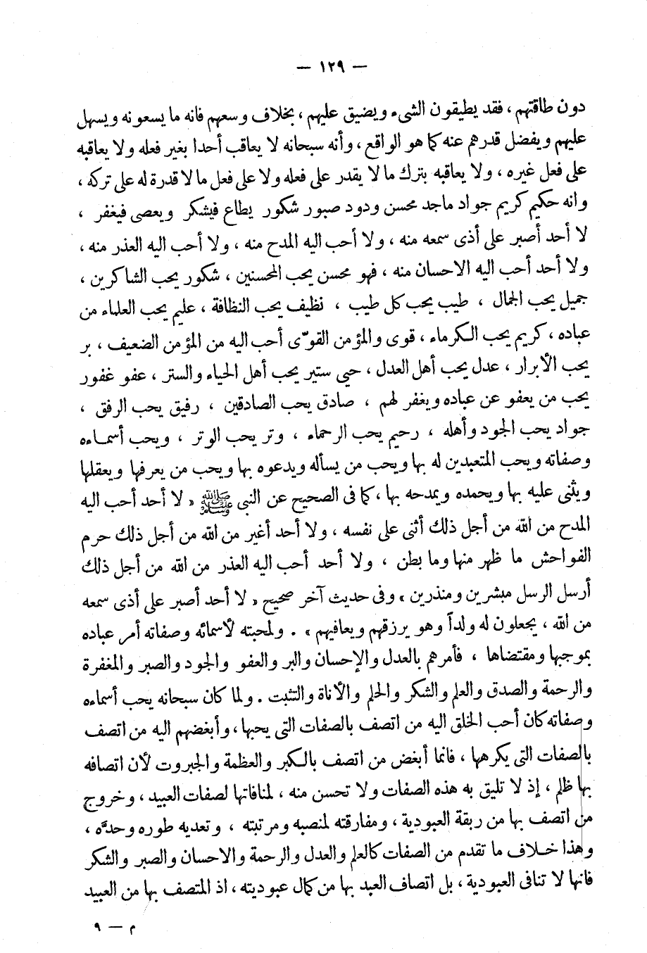 دون طاقتهم، فقد يطيقون الشيء ويضيق عليهم، بخلاف وسعهم فإِنه ما يسعونه ويسهل عليهم ويفضل قدرهم عنه كما هو الواقع، وأَنه سبحانه لا يعاقب أَحداً بغير فعله ولا يعاقبه على فعل غيره، ولا يعاقبه بترك ما لا يقدر على فعله ولا على فعل ما لا قدرة له على تركه، وأنه [سبحانه] حكيم كريم جواد ما جد محسن ودود وصبور شكور يطاع فيشكر ويعصى فيغفر، لا أَحد أصبر على أَذى سمعه منه، ولا أَحب إِليه المدح منه ولا أحب إليه العذر منه، ولا أحد أحب إليه الإحسان منه، فهو محسن يحب المحسنين، شكور يحب الشاكرين جميل يحب الجمال، طيب يحب كل طيب، نظيف يحب النظافة، عليم يحب العلماءَ من عباده، كريم يحب الكرماءَ، قوى والمؤمن القوى أَحب إِليه من المؤمن الضعيف، بر يحب الأَبرار، عدل يحب أَهل العدل حى ستير يحب أهل الحياءِ والستر عفو غفور يحب [من] يعفو من عباده ويغفر لهم، صادق يحب الصادقين، رفيق يحب الرفق، جواد يحب [الجود] وأهله، رحيم يحب الرحماءَ، وتر يحب الوتر، ويحب أَسماءه وصفات ويحب المتعبدين له بها ويحب من يسأَله ويدعوه بها ويحب من يعرفها ويعقلها [ويثنى] عليه بها ويحمده ويمدحه بها