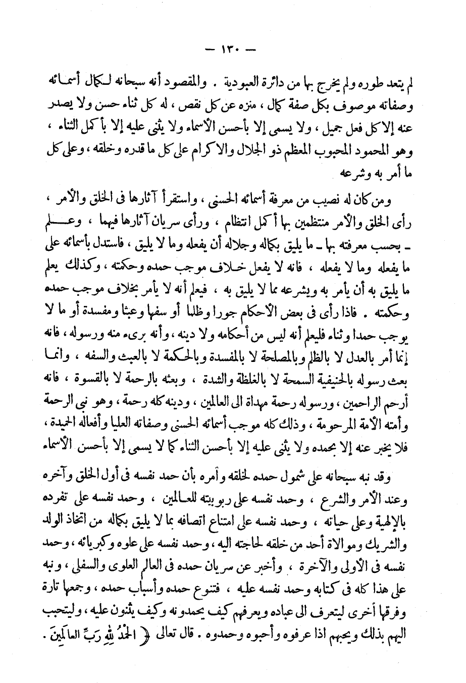 لم يتعد طوره ولم يخرج بها من دائرة العبودية والمقصود أَنه سبحانه لكمال أَسمائه وصفاته موصوف بكل صفة كمال، منزه عن كل نقص، له كل ثناءٍ حسن ولا يصدر عنه إِلا كل فعلٍ جميل، ولا يسمى إِلا [بأَحسن] الأَسماءِ ولا يثنى [عليه] إِلا بأَكمل الثناءِ وهو المحمود [المحبوب] المعظم ذو الجلال والإِكرام على كل ما قدره وخلقه، وعلى [كل] ما أَمر به وشرعه.