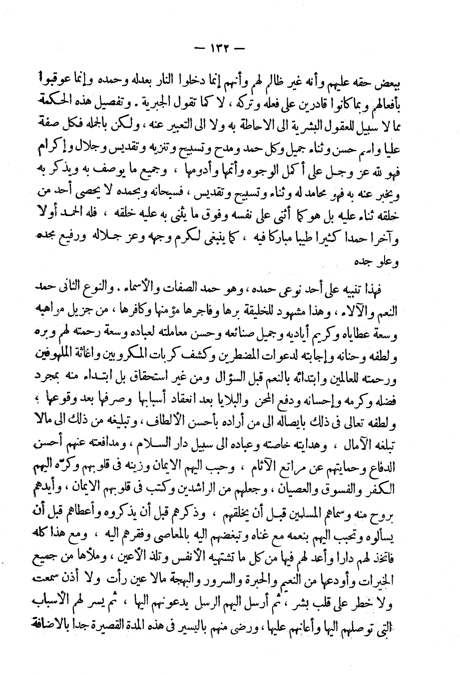 ببعض حقه عليهم وأنه غير ظالم لهم وأنهم إنما دخلوا النار بعدله وحمده وإنما عوقبوا بأفعالهم وبما كانوا قادرين على فعله وتركه، لا كما تقول الجبرية. وتفصيل هذه الحكمة مما لا سبيل للعقول البشرية إلى الإحاطة به ولا إلى التعبير عنه، ولكن بالجملة فكل صفة عليا واسم حسن وثناءٍ جميل وكل حمد ومدح وتسبيح وتنزيه وتقديس وجلال وإكرام فهو لله عز وجل على أكمل الوجوه وأتمها وأدومها، وجميع ما يوصف به ويذكر به ويخبر عنه فهو محامد له وثناءٌ وتسبيح وتقديس، فسبحانه وبحمده لا يحصى أحد من خلقه ثناءً عليه بل هو كما أثنى على نفسه وفوق ما يثنى عليه خلقه، فله الحمد أولاً وآخراً حمداً كثيراً طيباً مباركاً فيه، كما ينبغى لكرم وجهه وعز جلاله ورفيع مجده وعلو جده.