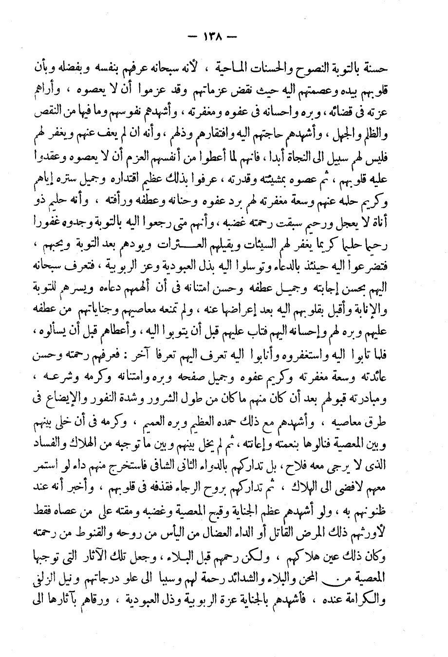 فتضرعوا إليه حينئذ بالدعاء وتوسلوا إليه بذل العبيد وعزا الربوبية فتعرف سبحانه إليهم بحسن إجابته وجميل عطفه وحسن امتنانه فى أن ألهمهم دعاءه ويسرهم للتوبة والإنابة وأقبلوا بقلوبهم إليه بعد إعراضها عنه، ولم تمنعه معاصيهم وجناياتهم من عطفه عليهم وبره لهم وإحسانه إليهم فتاب عليهم قبل أن يتوبوا إليه، وأعطاهم قبل أن يسألوه فلما تابوا إليه واستغفروه وأنابوا إليه تعرف إليهم تعرفاً آخر: فعرفهم رحمته وحسن عائدته وسعة مغفرته وكريم عفوه وجميل صفحه وبره وامتنانه وكرمه وشرعه، ومبادرته قبولهم بعد أن كان منهم ما كان من طول الشرور وشدة النفور والإيضاع فى طرق معاصيه، وأشهدهم مع ذلك حمده العظيم وبره العميم، وكرمه فى أن خلى بينهم وبين المعصية فنالوها بنعمته وإعانته، ثم لم يخل بينهم وبين ما توجبه من الإهلاك والفساد الذى لا يرجى معه صلاح، بل تداركهم بالدواء الشافى فاستخرج منهم داء لو استمر معهم لأفضى إلى الهلاك، ثم تداركهم بروح الرجاء فقذفه فى قلوبهم وأخبر أنه عند ظنونهم به، ولو أشهدهم عظم الجناية وقبح المعصية وغضبه ومقته على من عصاه فقط لأورثهم ذلك المرض القاتل أو الداء العضال من اليأْس من روحه والقنوط من رحمته، وكان ذلك عين هلاكهم، ولكن رحمهم قبل البلاء وفى حشو البلاء وبعد البلاء وجعل تلك الآثار التى توجبها معصيته من المحن والبلاء والشدائد رحمة لهم وسبباً إلى علو درجاتهم ونيل الزلفى والكرامة عنده، فأشهدهم بالجناية عزة الربوبية وذل العبودية، ورقاهم بآثارها إلى