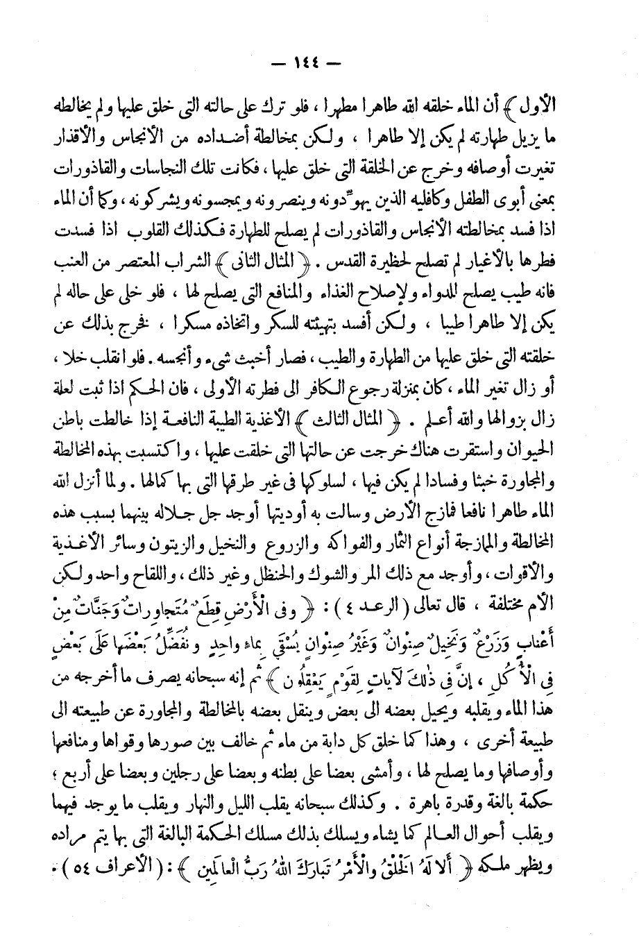 المثال الأول: أن الماء خلقه الله طاهراً مطهراً، فلو ترك على حالته التى خلق الله عليها ولم يخالطه ما يزيل طهارته لم يكن طاهراً، ولكن بمخاطة أضداده من الأنجاس والأقذار تغيرت اوصافه وخرج عن لاخلقة التى خلق عليها، فكانت تلك لانجاسات والقاذورات بمنزلة أيوى الطفل وكافليه لاذين يهودانه وينصرونه ويمجسونه ويشركونه، وكما أن الماء إذا فسد بمخالطته الأنجاس والقاذورات لم يصلح للطهارة، فكذلك القلوب إذا فسدت فطرها بالأغيار لم تصلح لحظيرة القدس.