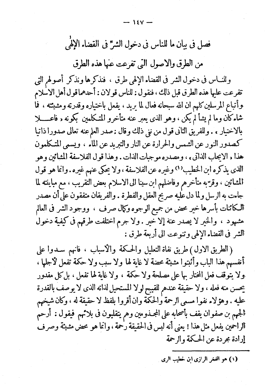والفريقان متفقون على أن مصدر الكائنات بأَسرها خير محض من جميع الوجوه وكمال صرف، ووجود الشر فى العالم مشهود، والخير لا يصدر عنه إلا خير. ولا جرم اختلفت طرقهم فى كيفية دخول الشر فى القضاء الإِلهى وتنوعت إلى أَربعة طرق: