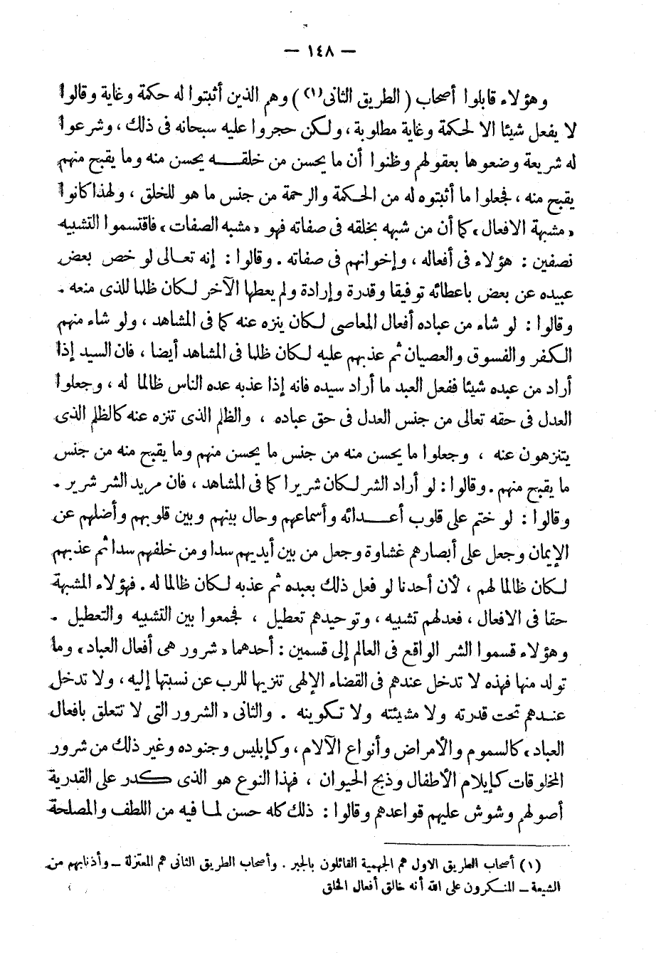 وهؤلاء قابلوا أصحاب الطريق الثانى: وهم الذين أثبتوا له حكمة وغاية، وقالوا: لا يفعل شيئاً إلا لحكمة وغاية مطلوبة، ولكن حجروا عليه سبحانه فى ذلك، وشرعوا له شريعة وضعوها بعقولهم وظنوا أن ما يحسن من خلقه يحسن منه وما يقبح منهم يقبح منه، فجعلوا ما أثبتوه له من الحكمة والرحمة من جنس ما هو للخلق، ولهذا كانوا "مشبهة الأفعال" كما أن من شبهة بخلقه فى صفاته فهو "مشبه الصفات" فاقتسموا التشبيه نصفين: هؤلاء فى أفعاله، وإخوانهم فى صفاته. وقالوا: إِنه تعالى لو خصّ بعض عبيده عن بعض بإِعطائه توفيقاً وقدرة وإرادة ولم يعطها لآخر لكان ظلماً للذى منعه. وقالوا: لو شاءَ من عباده أَفعال المعاصى لكان ينزه عنه كما فى المشاهد ولو شاءَ منهم الكفر والفسوق والعصيان ثم عذبهم عليه لكان ظلماً فى المشاهد أَيضاً، فإن السيد إذا أراد من عبده شيء ففعل ما أراد سيده، فإِنه إذا عذبه عده الناس ظالماً له، وجعلوا العدل فى حقه تعالى من جنس العدل فى حق عباده، والظلم الذى تنزه عنه كالظلم الذى يتنزهون عنه، وجعلوا ما يحسن منه من جنس ما يحسن منهم وما يقبح منه من جنس ما يقبح منهم. وقالوا: لو أَراد الشر لكان شريراً كما فى المشاهد، فإن مريد الشر شرير. وقالوا: لو ختم على قلوب أَعدائه وأسماعهم وحال بينهم وبين قلوبهم وأَضلهم عن الإِيمان وجعل على أَبصارهم غشاوة وجعل من بين أَيديهم سداً ومن خلفهم سداً ثم عذبهم لكان ظالماً لهم، لأَن أَحدنا لو فعل ذلك بعبده ثم عذبه لكان ظالماً له. فهؤلاء المشبهة حقاً فى الأفعال، فعدلهم تشبيه وتوحيدهم تعطيل، فجمعوا بين التشبيه والتعطيل.