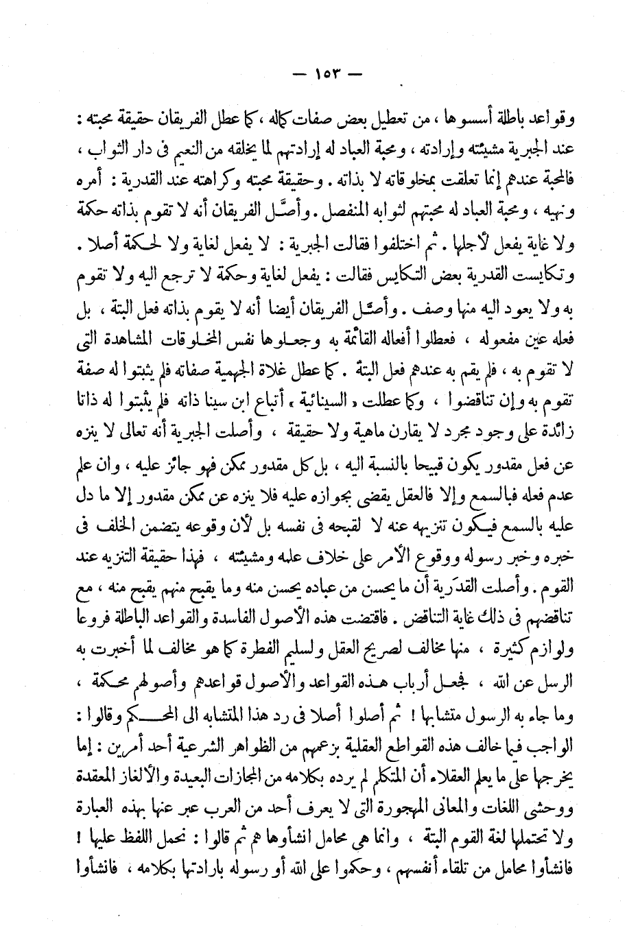 وأصَّل الفريقان أيضاً أنه لا يقوم بذاته فعل البتة، بل فعله عين مفعوله، فعطلوا أَفعاله القائمة به وجعلوها نفس المخلوقات المشاهدة التى لا تقوم به، فلم يقم به عندهم فعل البتة. كما عطل غلاة الجهمية صفاته فلم يثبتوا له صفة تقوم به وإن تناقضوا، وكما عطلت "السينائية" أَتباع ابن سينا ذاته فلم يثبتوا له ذاتاً زائدة على وجود مجرد لا يقارن ماهية ولا حقيقة، وأَصلت الجبرية أنه تعالى لا ينزه عن فعل مقدور يكون قبيحاً بالنسبة إليه، بل كل مقدور ممكن فهو جائز عليه، وإن علم عدم فعله فبالسمع وإلا فالعقل يقضى بجوازه عليه فلا ينزه عن ممكن مقدور إلا ما دل عليه بالسمع فيكون تنزيهه عنه لا لقبحه فى نفسه بل لأن وقوعه يتضمن الخلق فى خبره وخبر رسوله ووقع الأمر على خلاف علمه ومشيئته، فهذا حقيقة التنزيه عند القوم.