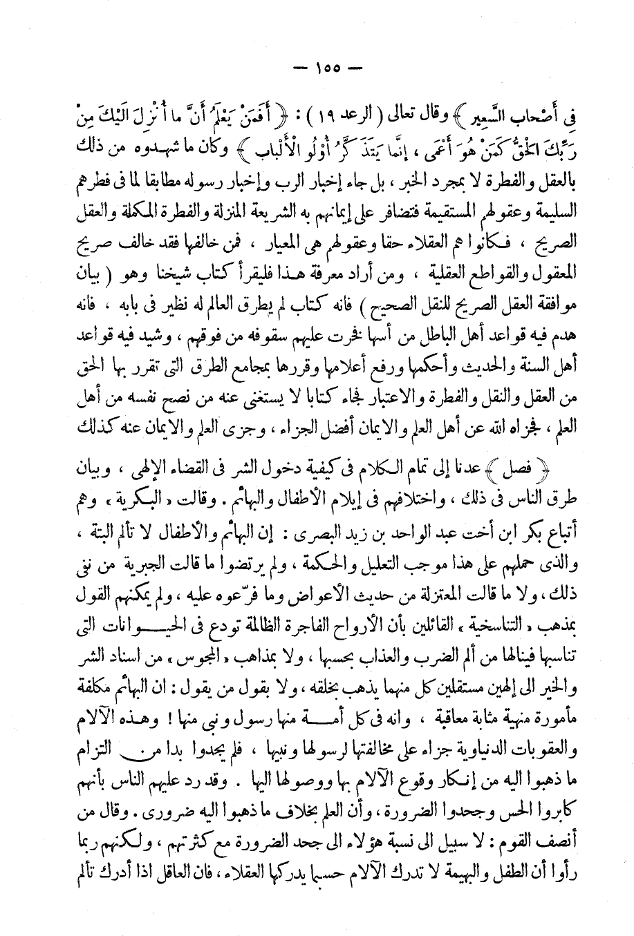 الْحقَّ وَيَهْدِى إِلَى صِرَاطِ الْعَزِيزِ الْحَمِيدِ} [سبأ: 6] ، ومن سواه من الصم والبكم [الذى] قال الله فيهم: {وَقَالُوا لَوْ كُنَّا نَسْمَعُ أَوْ نَعْقِلُ مَا [كنا] فِى أَصْحَابِ السَّعِيرِ} [الملك: 10] ، وقال تعالى: {أَفَمَنْ يَعْلَمُ أنما أُنْزِلَ إِلَيْكَ مِنْ رَبِّكَ الْحَقُّ كَمَنْ هُوَ أَعْمَى، إِنَّمَا يَتَذَكَّرُ أُولُوا الأَلْبَابِ} [الرعد: 19] ، وكان ما شهدوه من ذلك بالعقل والفطرة لا بمجرد الخبر، بل جاء إخبار الرب [تعالى] وإخبار رسوله مطابقاً لما فى فطرهم السليمة وعقولهم المستقيمة فتضافر على إِيمانهم به الشريعة المنزلة والفطرة المكملة والعقل الصريح فكانوا هم العقلاء حقاً وعقولهم هى المعيار، فمن خالفها فقد خالف صريح المعقول والقواطع العقلية، ومن أراد معرفة هذا فليقرأ كتاب شيخنا وهو "بيان موافقة العقل الصريح للنقل الصحيح" فإنه كتاب لم يطرق العالم له نظير فى بابه، فإِنه هدم فيه قواعد أَهل الباطل من أُسها فخرت عليهم سقوفه من فوقهم، وشيد فيه قواعد أَهل السنة والحديث وأحكمها ورفع [أعلامها وقررها بمجامع الطرق التى تقرر بها الحق] من العقل والنقل والفطرة والاعتبار فجاءَ كتاباً لا يستغنى من نصح [نفسه من أهل العلم عنه فجزاه الله عز وجل عن أهل العلم والإيمان] أفضل الجزاء، وجزى العلم والإيمان عنه [كذلك] .