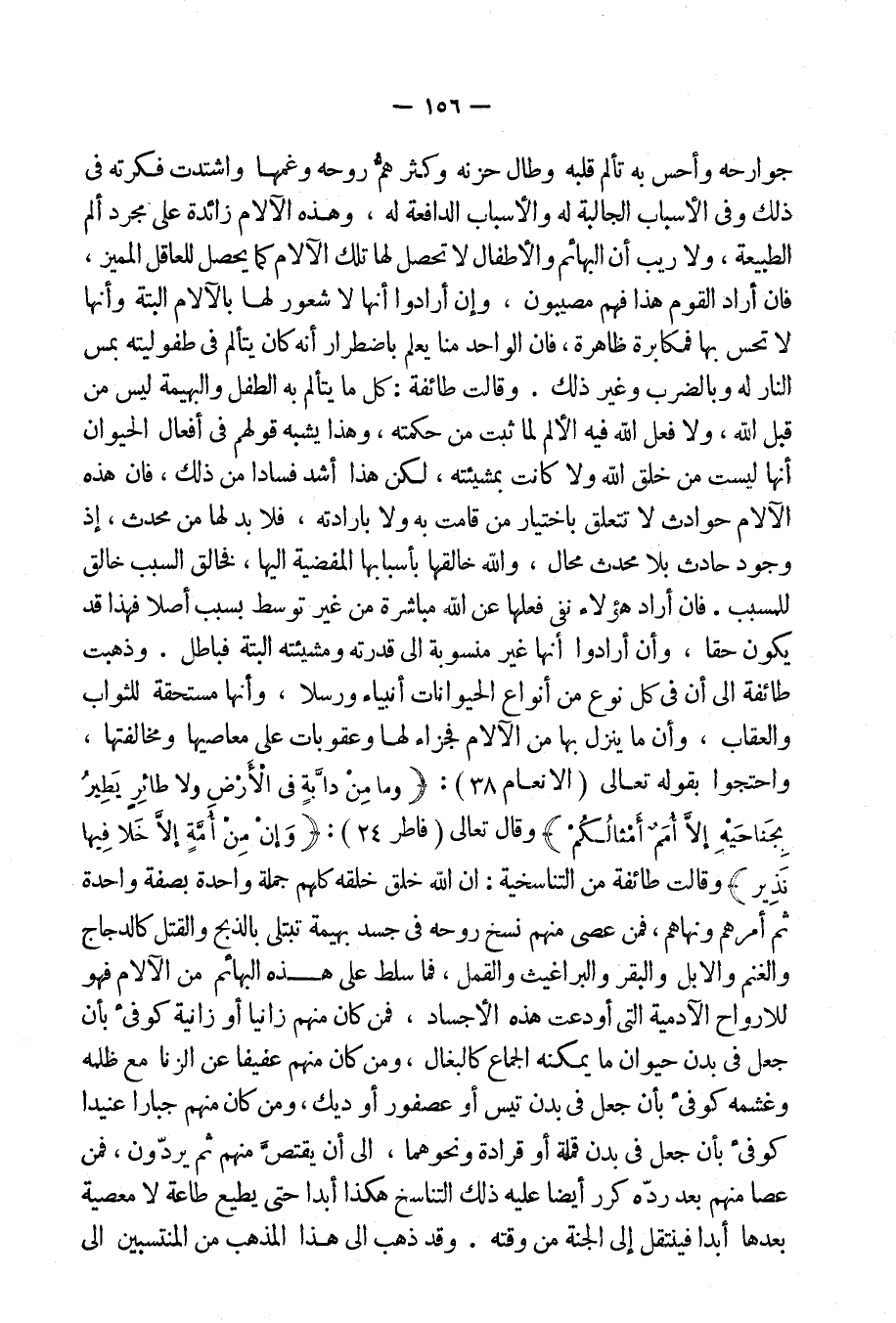 وقالت طائفة: كل ما يتأَلم به الطفل والبهيمة ليس من قبل الله، ولا فعل الله فيه الأَلم لما ثبت من حكمته وهذا يشبه قولهم فى أَفعال الحيوان أَنها ليست من خلق الله ولا كانت بمشيئته، لكن هذا أَشد فساداً من ذلك، فإِن هذه الآلام حوادث لا تتعلق باختيار من قامت به ولا بإِرادته فلا بد لها من محدث، إِذ وجود حادث محال والله خالقها بأسبابها المفضية إِليها، فخالق السبب خالق للمسبب. فإن أراد هؤلاءِ نفى فعلها عن الله مباشرة من غير توسط بسبب أَصلاً فهذا قد يكون حقاً، وإِن أَرادوا أَنها غير منسوبة إِلى قدرته ومشيئته البتة فباطل. وذهبت طائفة إِلى أن فى كل نوع من أَنواع الحيوانات أَنبياءَ ورسلاً، وأَنها مستحقة للثواب والعقاب، وأَن ما ينزل بها من الآلام فجزاءٌ لها وعقوبات على معاصيها ومخالفتها واحتجوا بقوله تعالى: {وَمَا مِنْ دَابَّةٍ فِى الأَرْضِ وَلا طَائِر يَطِيرُ بِجَنَاحَيْهِ إِلا أُمَمٌ أَمْثَالُكُمْ} [الأنعام: 38] ، وقال تعالى: {وَإِنْ مِنْ أُمّهِ إِلا خَلا فِيهَا نَذِيرٌ} [فاطر: 24] .