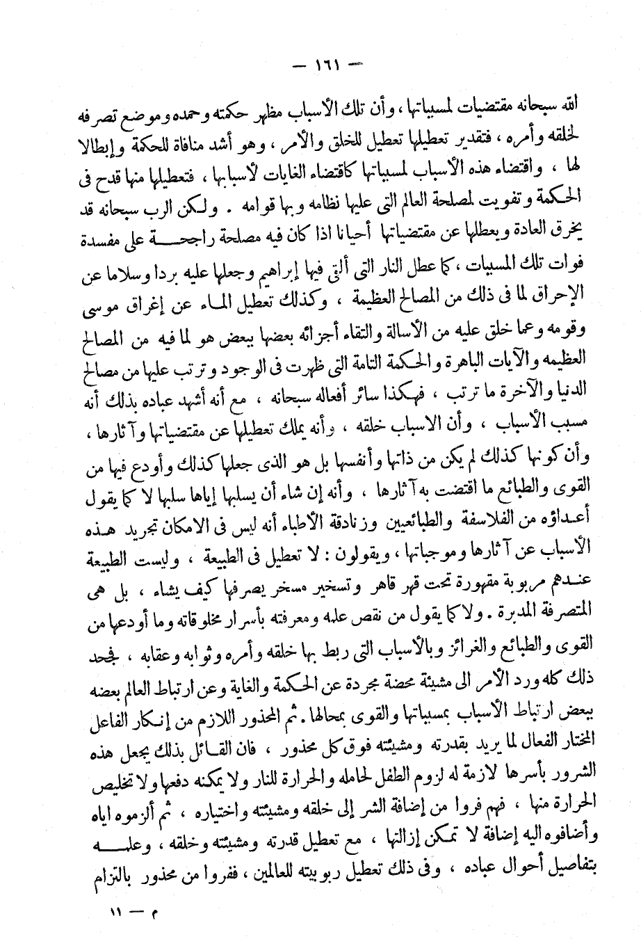 ولكن الرب سبحانه قد يخرق العادة ويعطلها عن مقتضياتها أحياناً إِذا كان فيه مصلحة راجحة على مفسدة فوات تلك المسببات، كما عطل النار التى أُلقى فيها إِبراهيم وجعلها عليه برداً وسلاماً عن الإِحراق لما فى ذلك من المصالح العظيمة، وكذلك تعطيل الماءِ عن إِغراق موسى وقومه وعما خلق عليه من الإِسالة والتقاء أَجزائه بعضها ببعض هو لما فيه من المصالح العظيمة والآيات الباهرة والحكمة التامة التى ظهرت فى الوجود وترتب عليها من مصالح الدنيا والآخرة ما ترتب، فهكذا سبحانه سائر أفعاله، مع أنه أشهد عباده بذلك أنه مسبب الأسباب وأن الأسباب خلقه وملكه وأنه يملك تعطيلها عن مقتضياتها وآثارها، وأن [جعلها] كذلك لم يكن من ذاتها وأنفسها، بل هو الذى جعلها كذلك وأودع فيها من القوى والطبائع ما اقتضت به آثارها، أنه إِن شاء أن يسلبها إياها سلبها لا كما يقول أعداؤه من الفلاسفة والطبائعيين وزنادقة الأطباءِ أنه ليس فى الإِمكان تجريد هذه الأسباب عن آثارها وموجباتها ويقولون: لا تعطيل فى الطبيعة، وليست الطبيعة عندهم مربوبة مقهورة تحت قهر قاهر وتسخير مسخر يصرفها كيف يشاء، بل هى المتصرفة المدبرة، ولا كما يقول من نقص علمه ومعرفته بأسرار مخلوقاته وما أودعها من القوى والطبائع والغرائز وبالأسباب التى ربط بها خلقه وأَمره وثوابه وعقابه، فجحد ذلك كله ورد الأمر إلى مشيئة محضة مجردة عن الحكمة والغاية وعن ارتباط العالم بعضه ببعض ارتباط الأسباب بمسبباتها والقوى بمحالها.