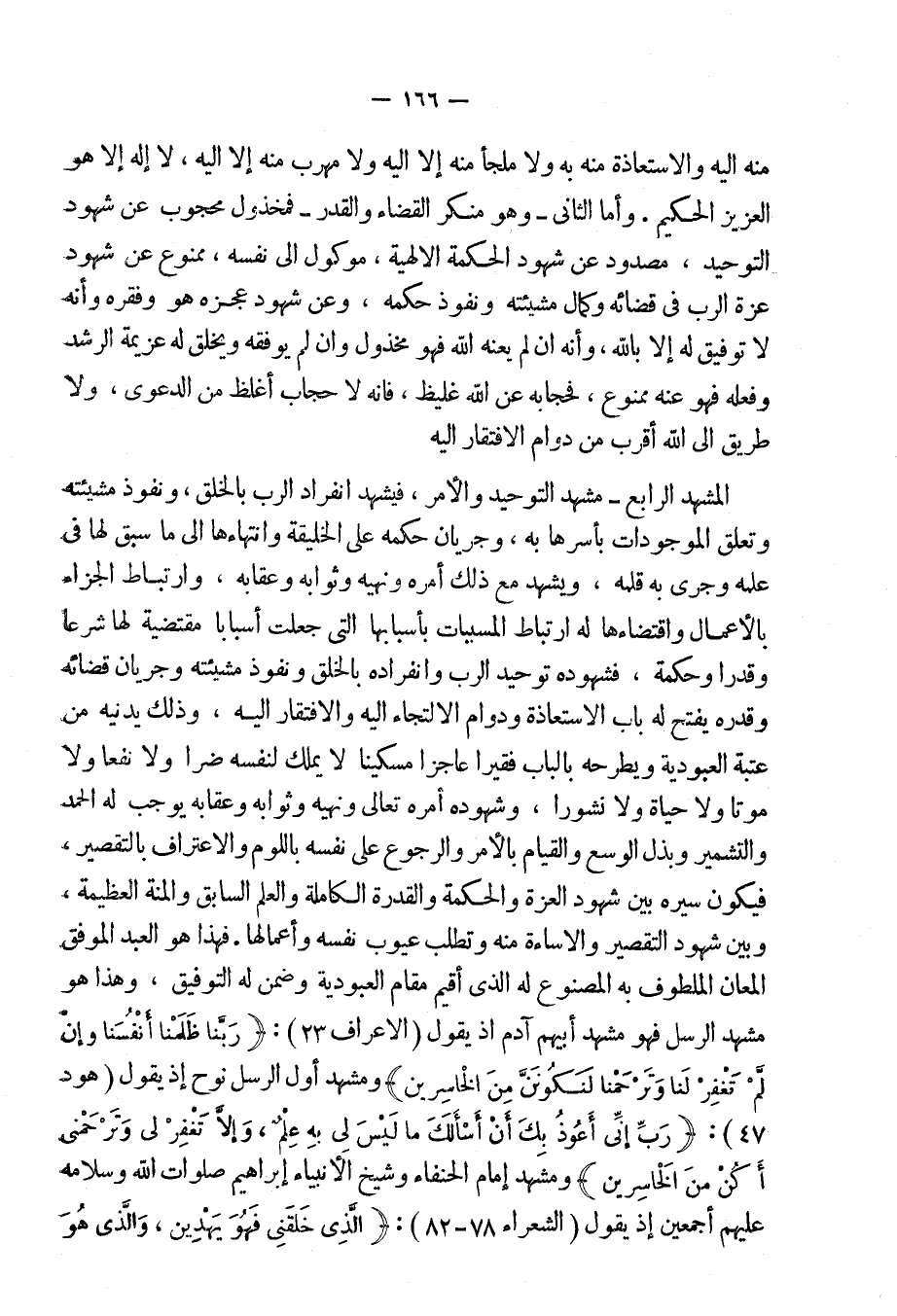 فهذا هو العبد الموفق المعان الملطوف به المصنوع له الذى أُقيم مقام العبودية وضمن له التوفيق، وهذا هو مشهد الرسل صلوات الله وسلامه عليهم فهو مشهد أَبيهم آدم إِذ يقول: {رَبَّنَا ظَلَمْنَا أَنْفُسَنَا وَإِنْ لَّمْ تَغْفِرْ لنَا وَتَرْحَمْنَا لَنَكُونَنَّ مِنَ الْخَاسِرِينَ} [الأعراف: 23] ، ومشهد أول الرسل نوح إذ يقول: {رَبِّ إِنِّى أَعُوذُ بِكَ أَنْ أَسْأَلَكَ مَا لَيْس لِى بِهِ عِلْمٌ، وإِلا تَغْفِرْ لِى وَتَرْحَمْنِى أكُنْ مِنَ الْخَاسِرِينَ} [هود: 47] ومشهد إمام الحنفاء وشيخ الأنبياء إبراهيم صلوات الله وسلامه عليهم أجمعين إذ يقول: {الَّذِى خَلَقَنِى فَهُوَ يَهْدِينِ وَالَّذِى هُوَ