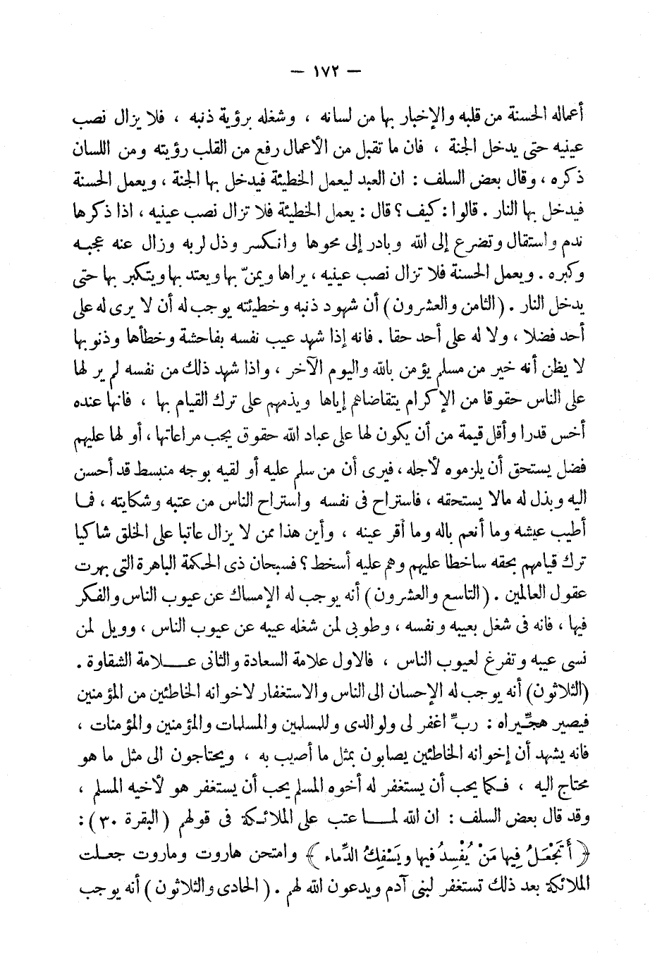 التاسع والعشرون: أنه يوجب له الإمساك عن عيوب الناس والفكر فيها، فإنه فى شغل بعيبه ونفسه، وطوبى لمن شغله عيبه عن عيوب الناس، وويل لمن نسى عيبه وتفرغ لعيوب الناس، فالأَول علامة السعادة، والثانى علامة الشقاوة.