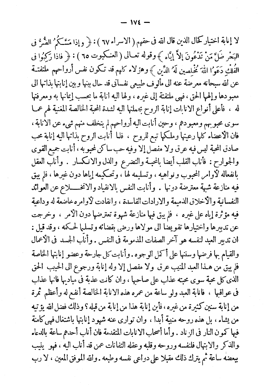 لا إِنابة اختيار كحال الذين قال الله فى حقهم: {وَإِذَا مَسَّكُمُ الضُرُّ فِى الْبَحْرِ ضَلَّ مَنْ تَدُْْعُونَ إِلا إِيَّاهُ} [الإسراء: 67] ، وقوله تعالى: {فَإِذا رَكِبُوا فِى الْفُلُكِ دَعُوُا الله مُخلِصِينَ لَهُ الدِّينَ} [العنكبوت: 65] ، وهؤلاء كلهم قد تكون نفس أَرواحهم ملتفتة عن الله سبحانه معرضة عنه إِلى مأْلوف طبيعى نفسانى قد حال بينها وبين إِنابتها بذاتها إلى معبودها وإلهها الحق، فهى ملتفتة إلى غيره ولها إليه إنابة ما بحسب إيمانها به ومعرفتها له