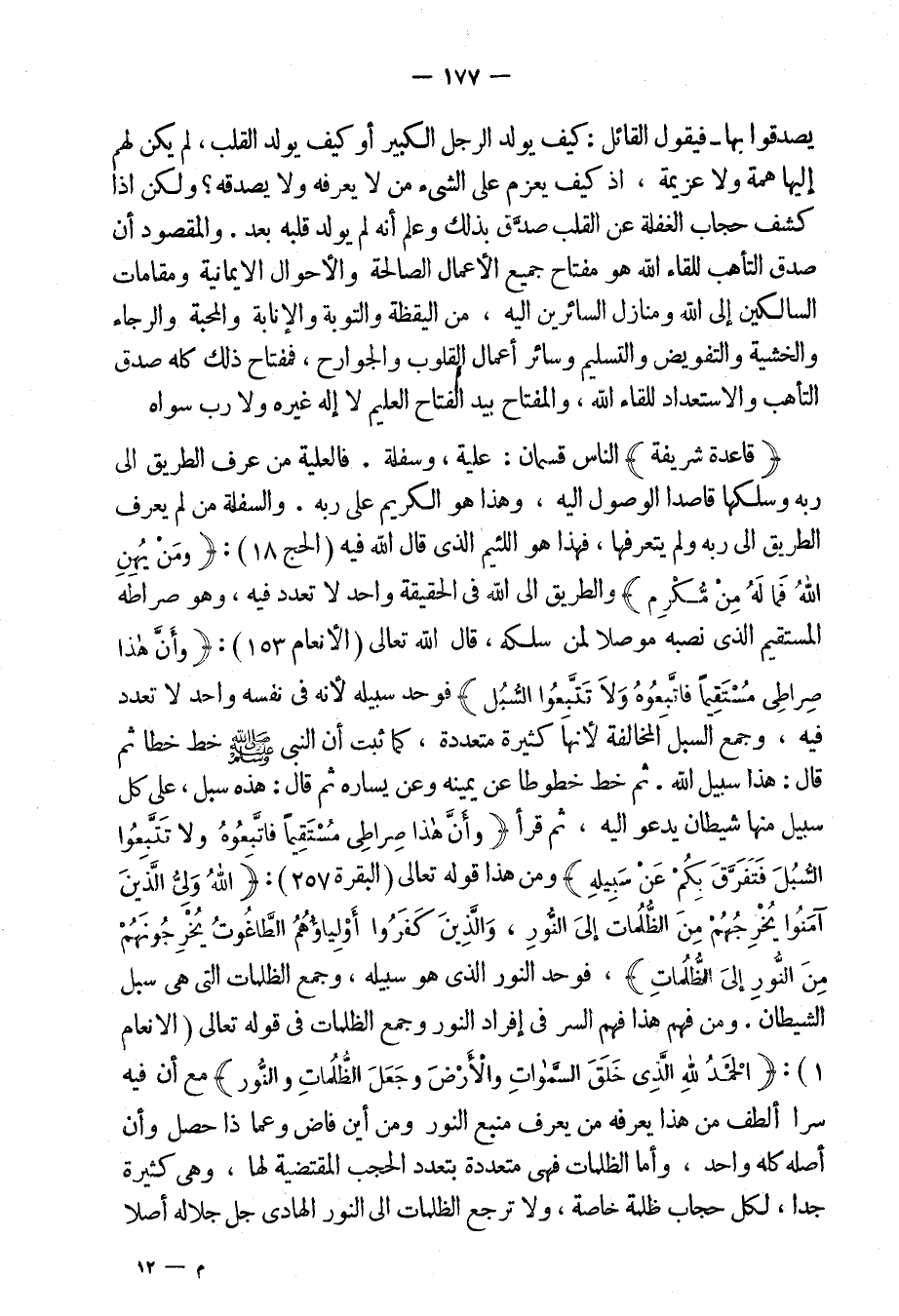 ومن فهم هذا فهم السر فى إفراد النور وجمع الظلمات فى قوله تعالى: {الْحَمْدُ للهِ الَّذِى خَلَقَ السَّمَوَاتِ وَالأَرْضَ وَجَعَلَ الظُّلُمَاتِ وَالنُّورَ} [الأنعام:1] مع أن فيه سراً أَلطف من هذا يعرفه من يعرف منبع النور ومن أَين فاض وعماذا حصل وأن أَصله كله واحد، وأَما الظلمات فهى متعددة بتعدد الحجب المقتضية لها، وهى كثيرة جداً، لكل حجاب ظلمة خاصة، ولا ترجع الظلمات إلى النور الهادى جل جلاله أصلاً