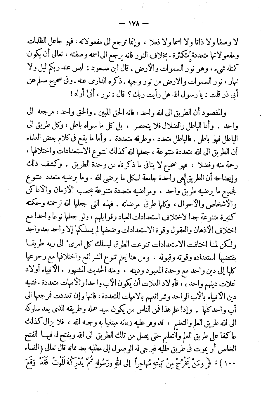 وأما ما يقع فى كلام بعض العلماء أَن الطريق إلى الله متعددة متنوعة جعلها الله كذلك لتنوع الاستعدادات واختلافها، رحمة منه وفضلاً، فهو صحيح لا ينافى ما ذكرناه من وحدة الطريق. وكشف ذلك وإيضاحه أن الطريق وهى واحدة جامعة لكل ما يرضى الله، وما يرضيه متعدد متنوع فجميع ما يرضيه طريق واحد، ومراضيه متعددة متنوعة بحسب الأَزمان والأَماكن والأَشخاص والأَحوال، وكلها طرق مرضاته، فهذه التى جعلها الله سبحانه لرحمته، وحكمته كثيرة متنوعة جداً لاختلاف استعدادات العباد وقوابلهم، ولو جعلها نوعاً واحداً مع اختلاف الأَذهان والعقول وقوة الاستعدادات وضعفها لم يسلكها إلا واحد بعد واحد، ولكن لما اختلفت الاستعدادات تنوعت الطرق ليسلك كل امريءٍ إلى ربه طريقاً يقتضيها استعداده وقوته وقبوله.
