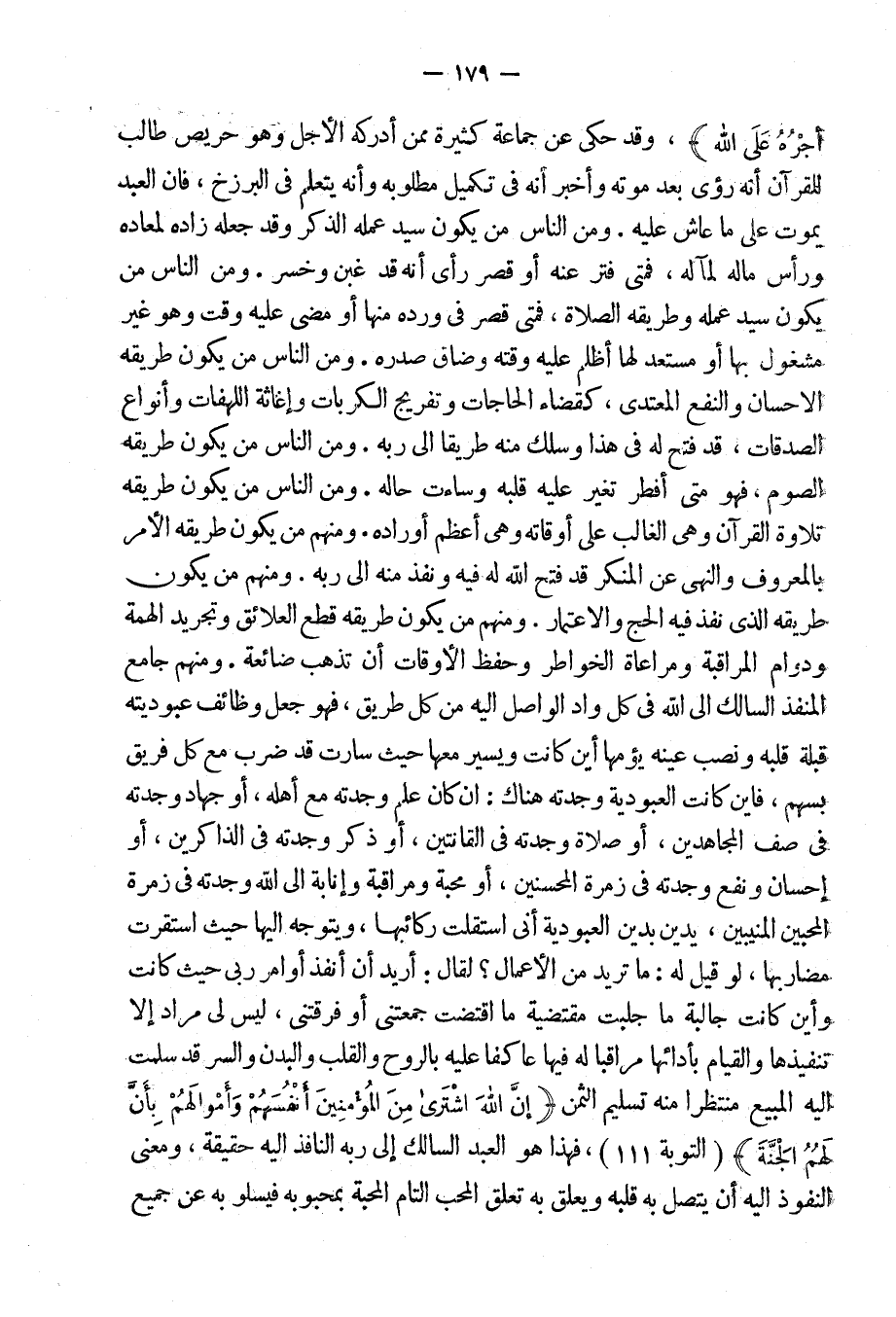 ومنهم من جامع المنفذ السالك إلى الله فى كل واد الواصل إليه من كل طريق، فهو جعل وظائف عبوديته قبلة قلبه ونصب عينه يؤمها أَين كانت ويسير معها حيث سارت قد ضرب من كل فريق بسهم، فأَين كانت العبودية وجدته هناك: إِن كان علم وجدته مع أَهله، أَو جهاد وجدته فى صف المجاهدين، أَو صلاة وجدته فى القانتين، أَو ذكر وجدته فى الذاكرين، أَو إحسان ونفع وجدته فى زمرة المحسنين، أَو ومراقبة ومحبه وإنابة إلى الله وجدته فى زمرة المحبين المنيبين، يدين بدين العبودية أَنَّى استقلت ركائبها، ويتوجه إليها حيث استقرت مضاربها، لو قيل له: ما تريد من الأعمال؟ لقال: أريد أن أنفذ أوامر ربى حيث كانت وأين كانت جالبة ما جلبت مقتضية ما اقتضت جمعيتين أو فرقتين أو فرقتنى، ليس لى مراد إلا تنفيذها والقيام بأدائها مراقباً له فيها عاكفاً عليه بالروح والقلب والبدن والسر قد سلمت إليه المبيع منتظراً منه تسليم الثمن: {إِنَّ اللهَ اشْتَرَى مِنَ الْمُؤْمِنِينَ أَنْفُسَهُمْ وَأَمْوَالَهُمْ بِأَنَّ لَهُمُ الْجَنَّة} [التوبة: 111] ، فهذا هو العبد السالك إلى ربه النافذ إليه حقيقة