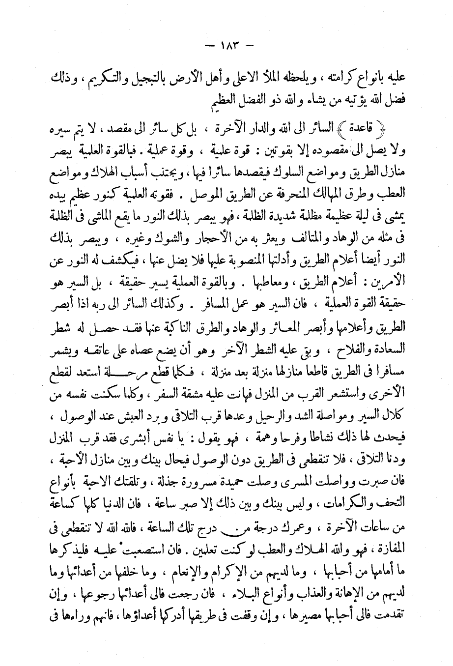 قاعدة: السائر إلى الله تعالى والدار الآخرة، بل كل سائر إلى مقصد، لا يتم سيره ولا يصل إلى مقصوده إلا بقوتين: قوة علمية، وقوة عملية، فبالقوة العلمية يبصر منازل الطريق، ومواضع السلوك فيقصدها سائراً فيها، ويجتنب أسباب الهلاك ومواضع العطب وطرق المهالك المنحرفة عن الطريق الموصل. فقوته العلمية كنور عظيم بيده يمشى به فى ليلة عظيمة مظلمة شديدة الظلمة، فهو يبصر بذلك النور ما يقع الماشى فى الظلمة فى مثله من الوهاد والمتالف ويعثر به من الأحجار والشوك وغيره، ويبصر بذلك النور أيضاً أعلام الطريق وأدلتها المنصوبة عليها فلا يضل عنها، فيكشف له النور عن الأمرين: أعلام الطريق، ومعطبها.