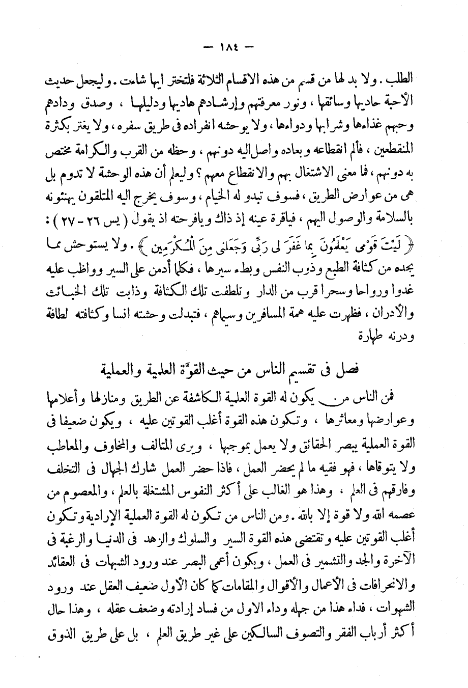 فمن الناس من يكون له القوة العلمية الكاشفة عن الطريق ومنازلها وأعلامها وعوارضها ومعاثرها، وتكون هذه القوة أَغلب القوتين عليه، ويكون ضعيفاً فى القوة العملية يبصر الحقائق ولا يعمل بموجبها، ويرى المتالف والمخاوف والمعاطب ولا يتوقاها، فهو فقيه ما لم يحضر العمل فإذا حضر العمل شارك الجهال فى التخلف وفارقهم فى العلم وهذا هو الغال على أَكثر النفوس المشتغلة بالعلم، والمعصوم من عصمة الله ولا قوة إلا بالله.