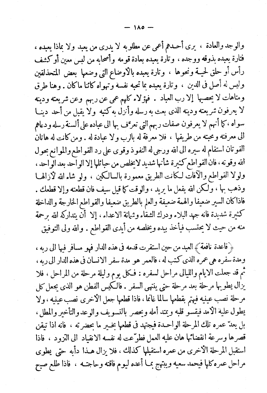 والوجد والعادة، يرى أحدهم أَعمى عن مطلوبه لا يدرى من يعبد ولا بماذا يعبده، فتارة يعبده بذوقه ووجده، وتارة يعبده بعادة قومه وأصحابه من لبس معين أو كشف رأْس أو حلق لحية ونحوها، وتارة يعبده بالأوضاع التى وضعها بعض المتحذلقين وليس له أصل فى الدين، وتارة يعبده بما تحبه نفسه وتهواه كائناً ما كان.