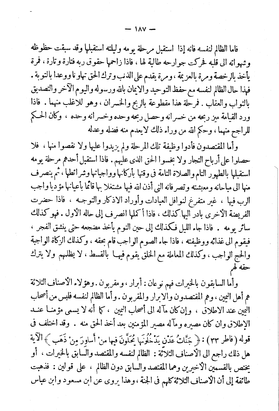 وأما المقتصدون فأدوا وظيفة تلك المرحلة ولم يزيدوا عليها ولم ينقصوا منها، فلا حصلوا على أرباح التجار ولا بخسوا الحق الذى عليهم. فإذا استقبل أحدهم مرحلة يومه استقبلها بالطهور التام والصلاة التامة فى وقتها بأركانها وواجباتها وشرائطها، ثم ينصرف منها إلى مباحاته ومعيشته وتصرفاته التى أذن الله له فيها مشتغلاً بها قائماً بأعيانها مؤدياً واجب الرب عالى فيها، غير متفرغ لنوافل العبادات وأوراد الأذكار والتوجه، فإذا حضرت الفريضة الأُخرى بادر إليها كذلك، فإذا أكملها انصرف إلى حاله الأول فهو كذلك سائر يومه، فإذا جاءَ الليل فكذلك إلى حين النوم يأْخذ مضجعه حتى ينشق الفجر فيقوم إلى غذائه وظيفته فإذا جاء الصوم الواجب ويقوم بحقه، وكذلك الزكاة الواجبة والحج الواجب، وكذلك المعاملة مع الخلق يقوم فيها بالقسط، لا يظلمهم ولا يترك حقه لهم.