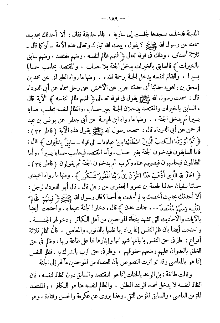 المدينة فدخلت مسجدها فجلست إلى سارية، فجاءَ حذيفة فقال: ألا أُحدثك بحديث سمعته من رسول الله صلى الله عليه وسلم؟ يقول: "يبعث الله تبارك وتعالى هذه الأُمة- أَو كما قال- ثلاثة أصناف، وذلك فى قوله تعالى: {فَمِنْهُمْ ظَالِمٌ لِنَفْسِهِ، وَمِنْهُمْ مُقْتَصِدٌ، وَمِنْهُمْ سَابِقٌ بِالْخَيْرَاتِ} [فاطر: 32] ، فالسابق بالخيرات يدخل الجنة بلا حساب والمقتصد يحاسب حساباً يسيراً، والظالم لنفسه يدخل الجنة برحمة الله.