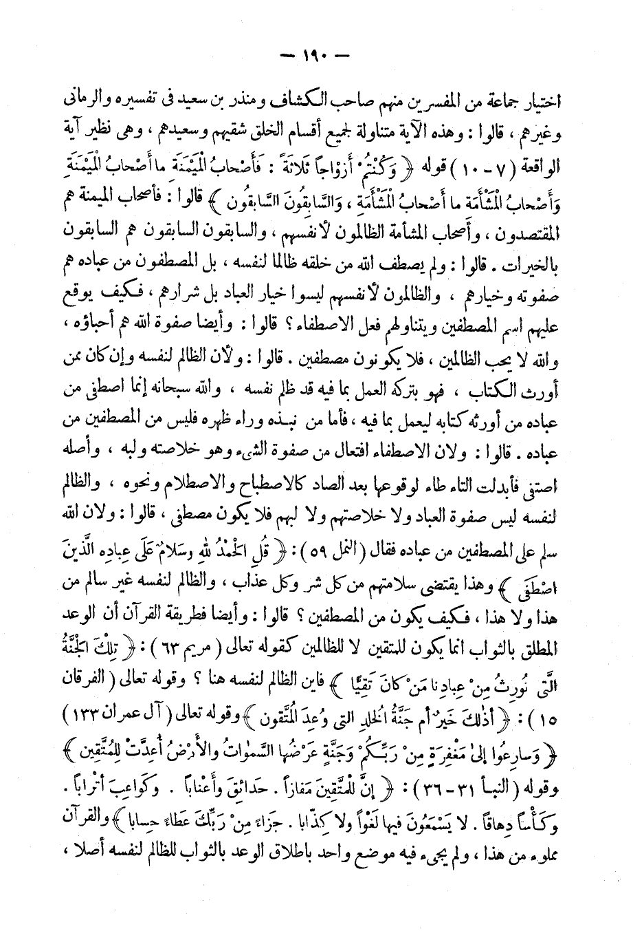 قالوا: ولم [يصطفى] الله من خلقه ظالماً لنفسه، بل المصطفون من عباده هم صفوته وخيارهم والظالمون لأنفسهم ليسوا خيار العباد بل شرارهم، فكيف يوقع عليهم [اسم المصطفين وتناولهم فعل الأصطفاء؟ قالوا: فأيضاً صفوة الله هم أحباؤه والله لا يحب الظالمين فلا يكونون مصطفين قالوا: ولن الظالم لنفسه وإن كان] ممن أورث الكتاب، فهو بتركه العمل بما فيه قد ظلم نفسه والله [تعالي] إِنما اصطفى من عباده من أورثة كتابه ليعمل بما فيه فأما من نبذه وراء ظهوره فليس من المصطفين من عباده قالوا: ولأن الاصطفاء افتعال من صفوة الشيء وهو خلاصته ولبه، وأصله اصتفى فأُبدلت التاءُ طاءً لوقوعها بعد الصاد كالاصطباح والاصطلام ونحوه، والظالم لنفسه ليس صفوة العباد ولا خلاصتهم ولا لبهم فلا يكون مصطفى، قالوا: ولأن الله سلَّم على المصطفين من عباده فقال: {قُلِ الْحَمْدُ للهِ وَسَلامٌ عَلَى عِبَادِهِ الَّذِين اصطفى} [النمل: 59] ، وهذا يقتضى سلامتهم من كل شر وكل عذاب، والظالم لنفسه غير سالم من هذا ولا هذا فكيف يكون من المصطفين؟ قالوا: وأيضاً فطريقة القرآن أن الوعد المطلق بالثواب إِنما يكون للمتقين لا للظالمين كقوله تعالى: {تِلْكَ الْجَنَّةُ الَّتِى نُورثُ مِنْ عِبَادِنَا مَن كَانَ تَقِيّاً} [مريم: 63] فأَين الظالم لنفسه هنا؟ وقوله تعالى: {أَذَلِكَ خَيْرٌ أَمْ جَنَّةُ الْخُلْدِ الَّتِى وُعِدَ المُتَّقون} [الفرقان: 15] ، وقوله تعالى: {وَسَارِعُوا إِلَى مَغْفِرةٍ مِن رَبِّكُمْ وَجَنَّةٍ عَرْضُهَا السَّمَوَاتُ وَالأَرْضُ أُعدَّت لِلْمُتَّقِينَ} [آل عمران: 132] ، وقوله: {إِنَّ لِلْمُتَّقِينَ مَفَازاً حَدَائِقَ وَأَعْنَاباً وَكَوَاعِبَ أَتْرَاباً وَكَأْساً دِهَاقاً لا يَسْمَعُونَ فِيهَا لَغْواً وَلا كِذَّاباً جَزَاءً مِنْ رَبِّكَ عَطَاءً حِسَاباً} [النبأ: 31- 36] ، [والقرآن] مملوءٌ من هذا، ولم يجيء [فيه موضع واحد بإطلاق الوعد بالثواب للظالم لنفسه أصلاً