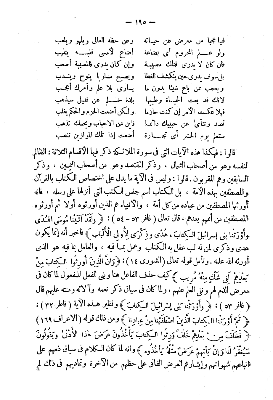 قالوا: وليس في الآية ما يدل على اختصاص الكتاب بالقرآن والمصطفين بهذه الأمة، بل الكتاب اسم جنس للكتب التي أنزلها على رسله، فإنه أورثها المصطفين من عباده من كل أمة، والأنبياء هم الذين أورثوه أولا ثم أورثوه المصطفين من عباده من كل أمة، والأنبياء هم الذين أورثوه أولا ثم أورثوه المصطفين من أممهم بعدهم، قال تعالى: {وَلَقَدْ آتَيْنَا مُوسَى الْهُدَى وَأَوْرَثْنَا بَنِي إِسْرائيلَ الْكِتَاب هُدىً وَذِكْرَى لأُولِي الأَلْبَابِ} [غافر 54:53] ، فأخبر أنه إنما يكون هدى وذكرى لمن له لب عقل به الكتاب وعمل بما فيه، والعامل بما فيه هو الذي أورثه الله علمه.