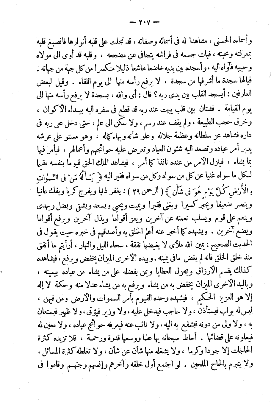 ويشهده كما أَخبر عنه أعلم الخلق به وأصدقهم فى خبره حيث يقول فى الحديث الصحيح: "يمين الله ملأَى لا يغيضها نفقة، سحاءَ الليل والنهار، أَرأَيتم ما أنفق منذ خلق الخلق فإِنه لم يغض ما فى يمينه، وبيده الأُخرى الميزان يخفض ويرفع"، فيشاهده كذلك يقسم الأرزاق ويجزل العطايا ويمن بفضله على من يشاءُ من عباده بيمينه، وباليد الأُخرى الميزان يخفض به من يشاء ويرفع به من يشاءُ عدلاً منه وحكمة لا إله إلا هو العزيز الحكيم، فيشهده وحده القيوم بأمر السموات والأرض ومن فيهن، ليس له بواب فيستأْذن ولا حاجب فيدخل عليه، ولا وزير فيؤتى ولا ظهير فيستعان به ولا ولى من دونه فيشفع به إليه، ولا نائب عنه فيعرفه حوائج عباده، ولا معين له فيعاونه على قضائها، [بل قد] أحاط سبحانه بها علماً ووسعها قدرة ورحمة، فلا تزيده كثرة الحاجات إلا جوداً وكرماً، ولا يشغله منها شأْن عن شأْن، ولا تغلطه كثرة المسائل، ولا يتبرم بإلحاح الملحين.