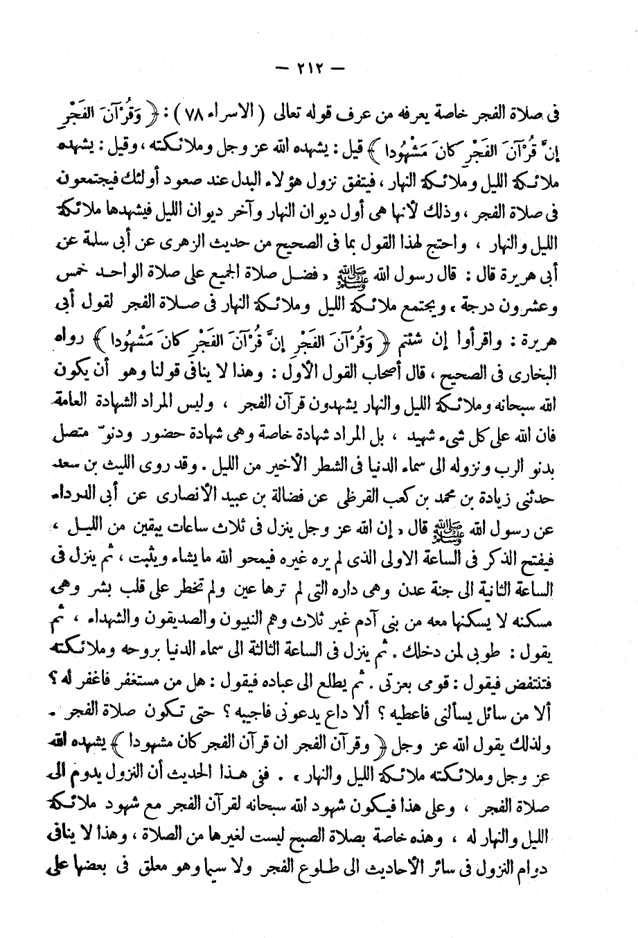 ففى هذا الحديث أن النزول يدوم إلى صلاة الفجر، وعلى هذا فيكون شهود [الله] سبحانه لقرآن الفجر مع شهود ملائكة الليل والنهار له، وهذه خاصة بصلاة الصبح ليست لغيرها من [الصلوات] ، وهذا لا ينافى دوام النزول فى سائر الأحاديث إلى طلوع الفجر ولا سيما وهو معلق فى بعضها على