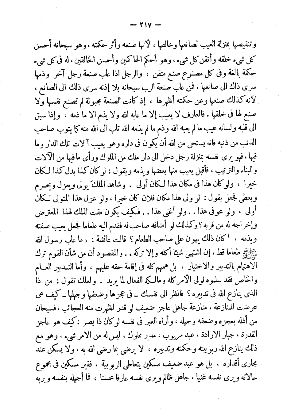 وتنقيصها بمنزلة العيب لصانعها وخالقها، لأنها صنعه وأَثر حكمته، وهو سبحانه أحسن كل شيء فى خلقه وأَتقن كل شيء وهو أحكم الحاكمين وأَحسن الخالقين، له فى كل شيء حكمة بالغة وفى كل مصنوع صنع متقن، والرجل إذا عاب صنعة [رجل آخر وذمها سرى ذلك إلى صانعها فمن عاب صنعة] الرب سبحانه بلا إذنه سرى ذلك إلى الصانع، لأنه كذلك صنعها عن حكمته أظهرها، إذ كانت الصنعة مجبولة لم تصنع نفسها ولا صنع لها فى خلقها.