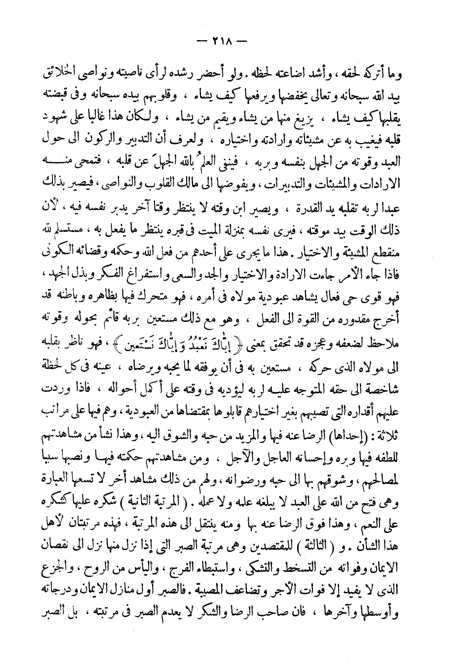 هذا ما يجرى على أحدهم من فعل الله وحكمه وقضائه الكونى، فإذا جاءَ الأَمر جاءت الإِرادة والاختيار [السعى والجد] واستفراغ الفكر وبذل الجهد، فهو قوى حى فعال يشاهد عبودية مولاه فى أَمره، فهو متحرك فيها بظاهره وباطنه قد أَخرج مقدوره من القوة إلى الفعل، وهو مع ذلك مستعين بربه قائم بحوله وقوته ملاحظ لضعفه وعجزه قد تحقق بمعنى: {إِيّاكَ نَعْبُدُ وَإِيَّاكَ نَسْتَعِينُ} [الفاتحة: 5] ، فهو ناظر بقلبه إِلى مولاه الذى حركه، مستعين به فى أَن يوفقه لما يحبه ويرضاه، عينه فى كل لحظة شاخصة إلى حقه المتوجه عليه لربه ليؤديه فى وقته على أَكمل أحواله، فإِذا وردت عليهم أَقداره التى تصيبهم بغير اختيارهم قابلوها بمقتضاها من العبودية، وهم فيها على مراتب ثلاثة: