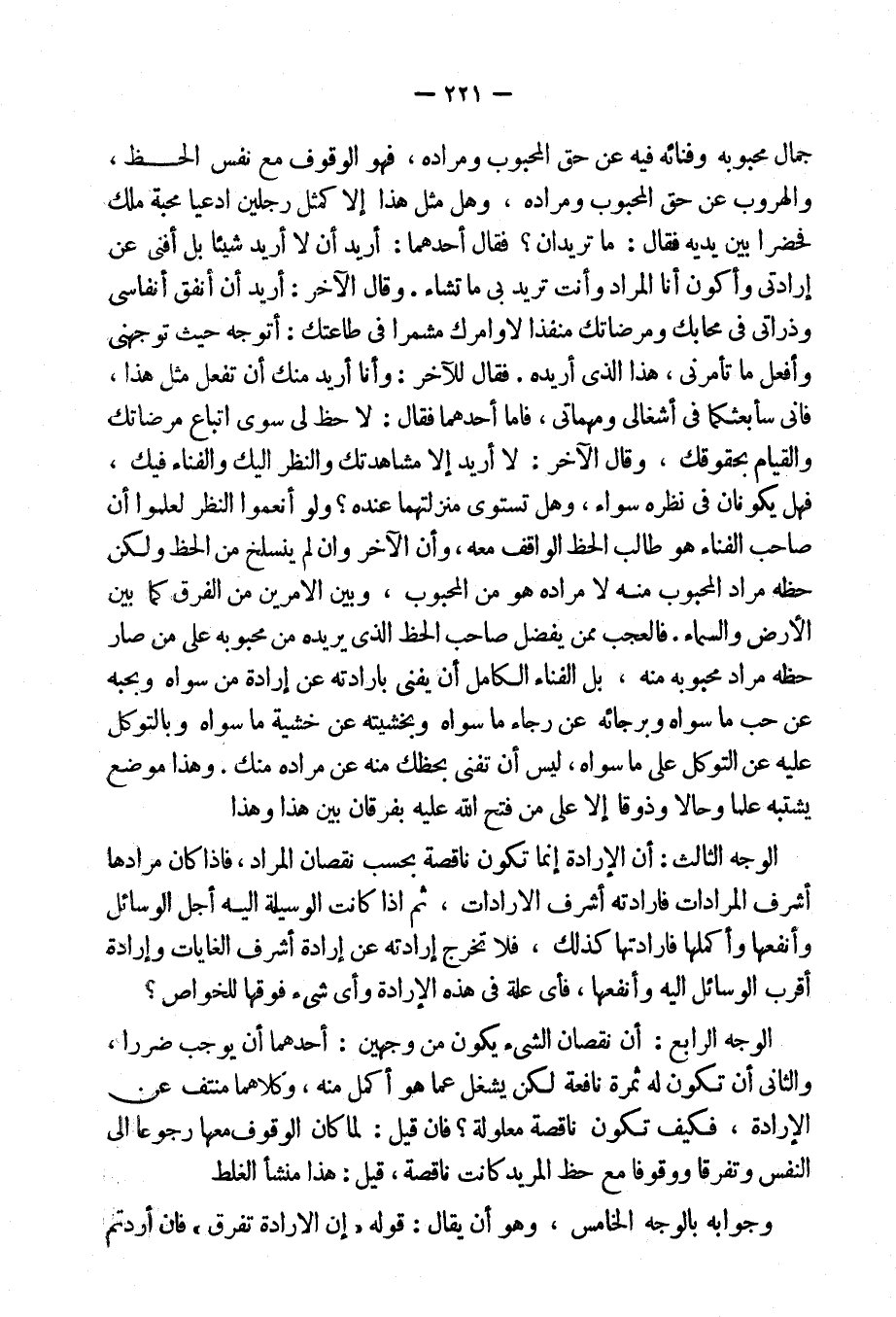 جمال محبوبه وفنائه فيه عن حق المحبوب ومراده، فهو الوقوف مع نفس الحظ والهروب عن حق المحبوب ومراده، وهل مثل هذا إلا كمثل رجلين ادعيا محبة ملك فحضرا بين يديه فقال: ما تريدان؟ فقال أحدهما: أُريد أَن لا أُريد شيئاً بل أَفنى عن إِرادتى وأَكون أنا المراد وأنت تريد بى ما تشاءُ.