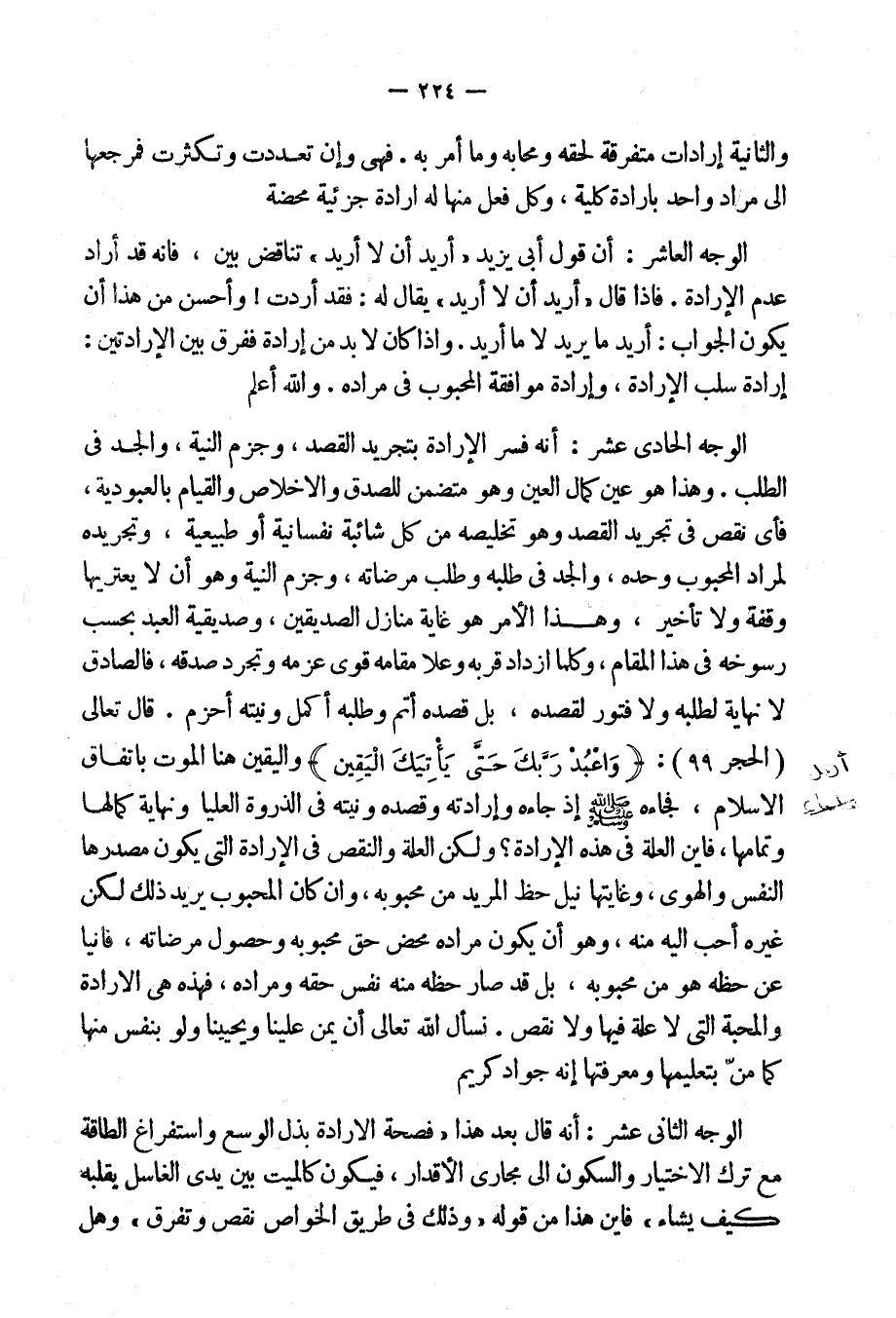 الوجه الحادى عشر: أَنه فسر الإِرادة بتجريد القصد وجزم النية، والجد فى الطلب. وهذا هو عين كمال [العبد] وهو متضمن للصدق والإخلاص والقيام بالعبودية، فأَى نقص فى تجريد القصد وهو تخليصه من كل شائبة نفسانية أَو طبيعية وتجريده لمراد المحبوب وحده، والجد فى طلبه وطلب مرضاته وجزم النية وهو أَن لا يعتريها وقفة ولا تأْخير، وهذا الأَمر هو غاية منازل الصديقين، وصديقية العبد بحسب رسوخه فى هذا المقام، وكلما ازداد قربه وعلا مقامه قوى عزمه وتجرد صدقه، فالصادق لا نهاية لطلبه ولا فتور لقصده، بل قصده أَتم وطلبه أكمل ونيته. قال تعالى: {وَاعْبُدْ رَبَّكَ حَتَّى يَأْتِيكَ الْيَقِينْ} [الحجر:99] ، واليقين هنا الموت باتفاق [أهل] الإسلام، فجاء صلى الله عليه وسلم إذ جاءه وإرادته وقصده ونيته فى الذروة العليا ونهاية كمالها وتمامها، فأين العلة فى هذه الإرادة؟ ولكن العلة والنقص فى الإِرادة التى يكون مصدرها النفس والهوى، وغايتها نيل حظ المريد من محبوبه، وإن كان المحبوب يريد ذلك لكن غيره أحب إليه منه، وهو أن يكون مراده محض حق محبوبه وحصول مرضاته، فانياً عن حظه هو من محبوبه، بل قد صار حظه منه نفس حقه ومراده، فهذه هى الإِرادة والمحبة التى لا عِلَّة فيها ولا نقص.