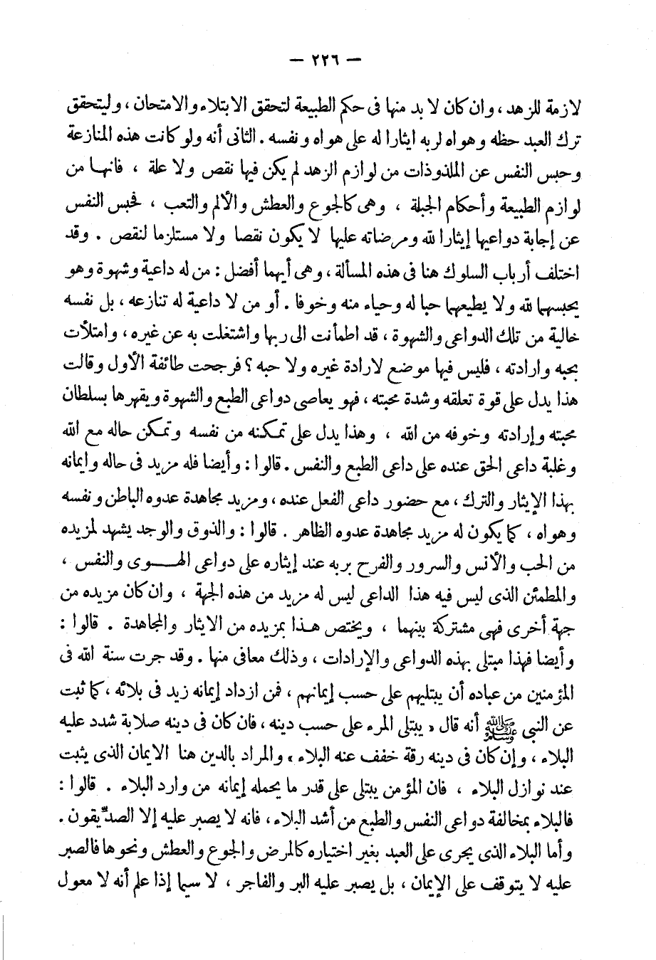 الثانى: أَنه لو كانت هذه المنازعة وحبس النفس عن الملذوذات من لوازم الزهد لم يكن فيها نقص ولا علة، فإِنها من لوازم الطبيعة وأَحكام الجبلّة، وهى كالجوع والعطش والأَلم والتعب، فحبس النفس عن إجابة دواعيها إيثاراً لله ومرضاته عليها لا يكون نقصاً ولا مستلزماً لنقص.